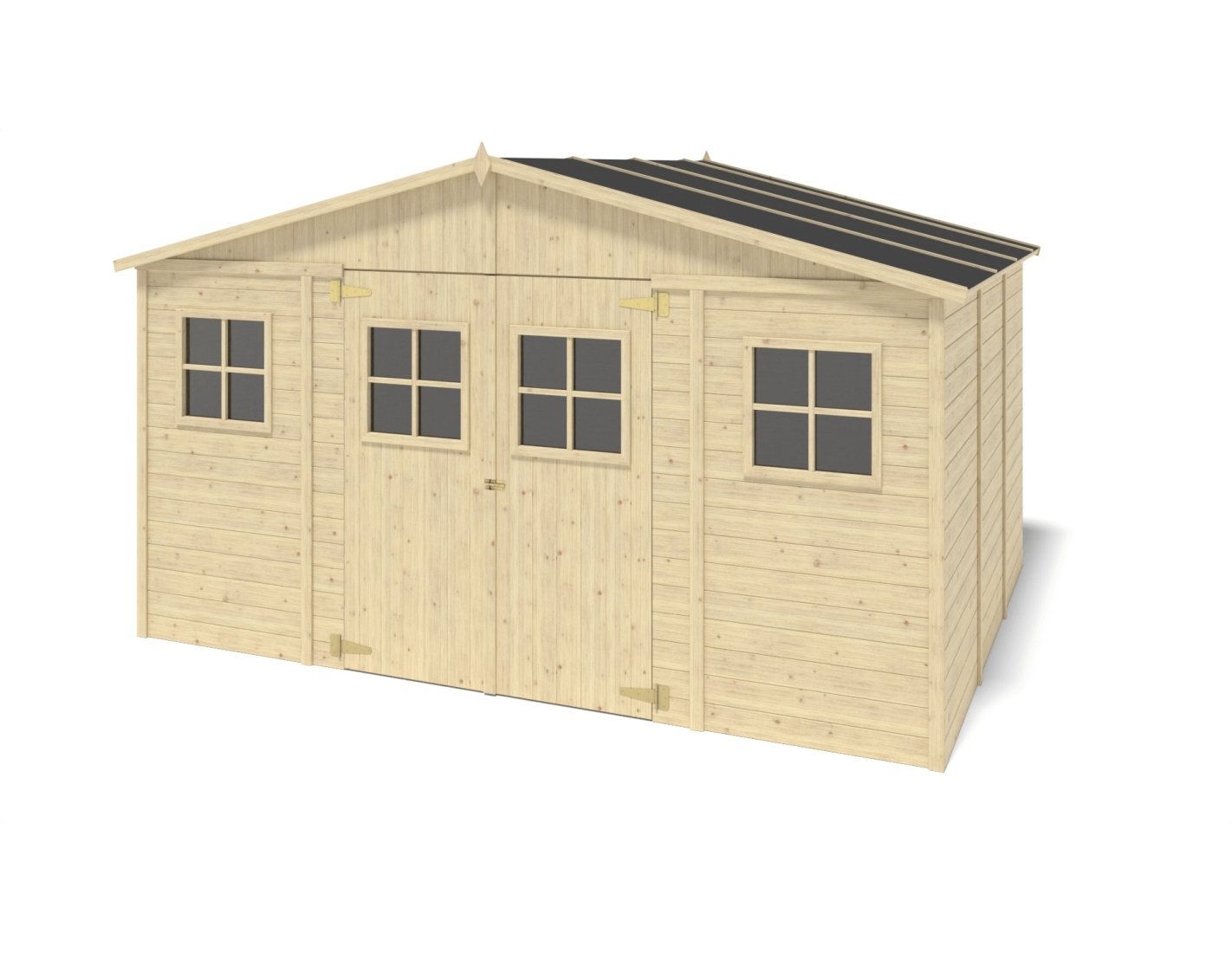 Abri de jardin en bois, à outils DOM667 d'une surface de 11.88 m2, avec une largeur de 4 m en façade, une profondeur de 2.97 m et une épaisseur de parois de 16 mm. L'assemblage de l'abri avec les instructions incluses ne pose pas de problème.
