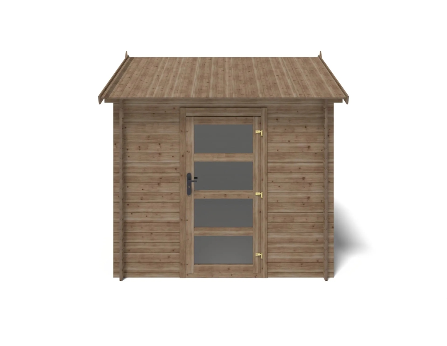 Sur les photos, il y a un chalet en bois DOM675 d'une superficie de 7.5m2. Dimensions au sol : L 2.5m et P 3m.