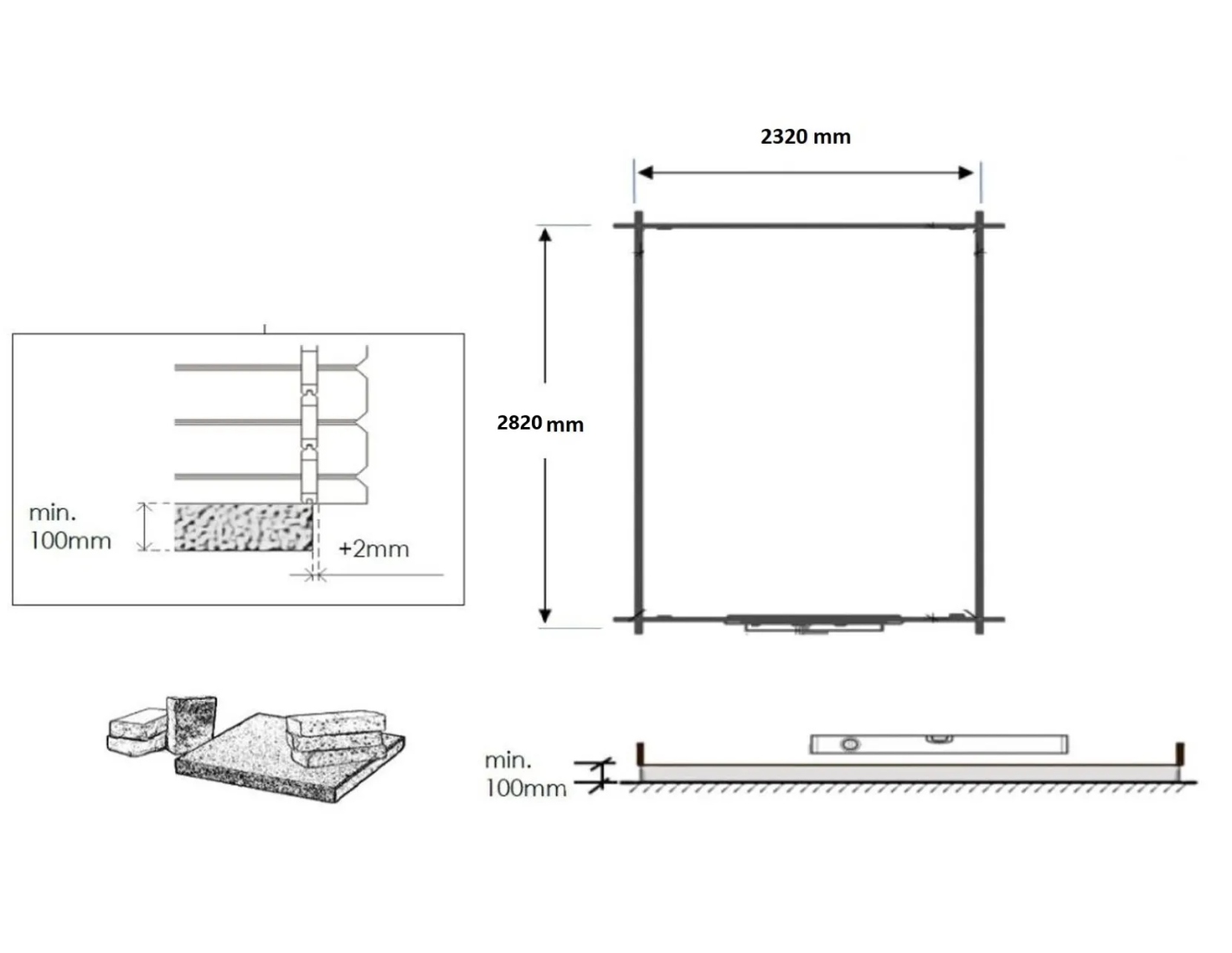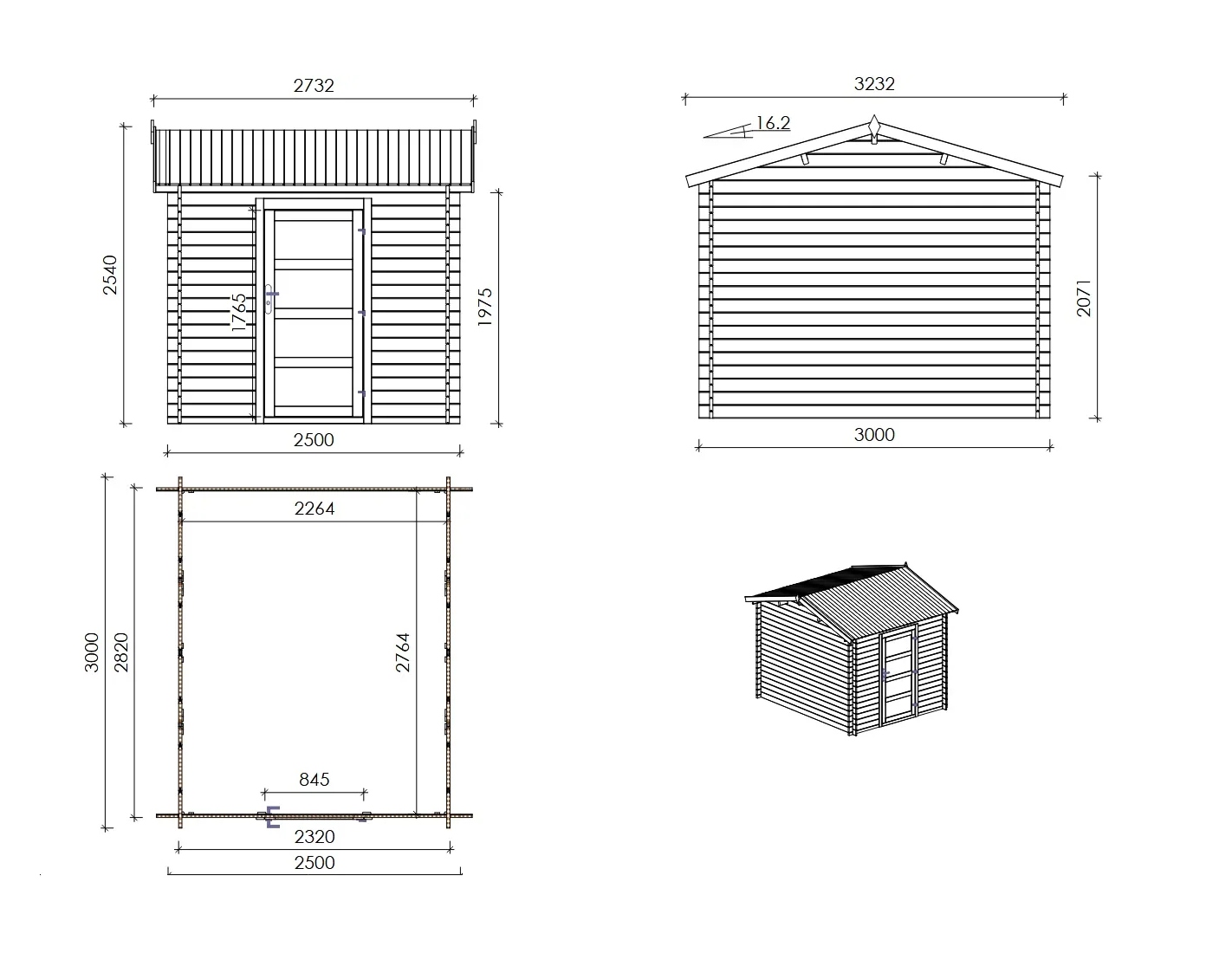 Abri à outils en bois DOM675+DOS194 d’une superficie de 7.5 m², avec une façade de 2.5 m, une profondeur de 3 m et une épaisseur de parois de 28 mm.