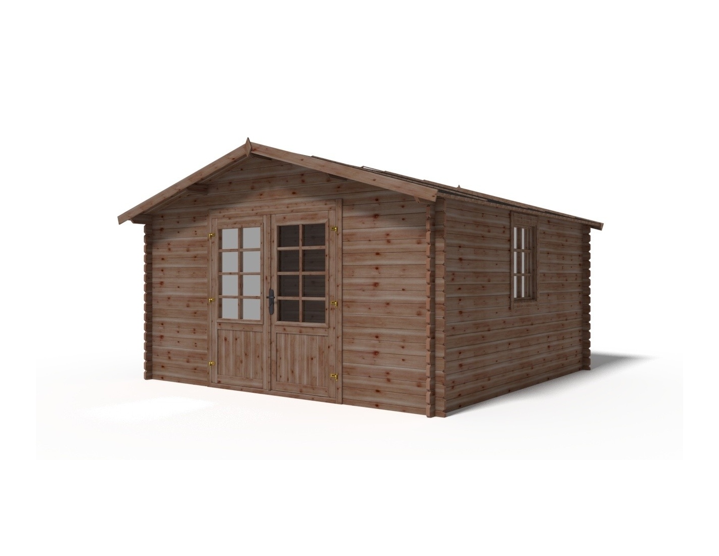 Sur les photos, il y a un chalet en bois DOM563 d'une superficie de 15.2m2. Dimensions au sol : L 3.9m et P 3.9m.