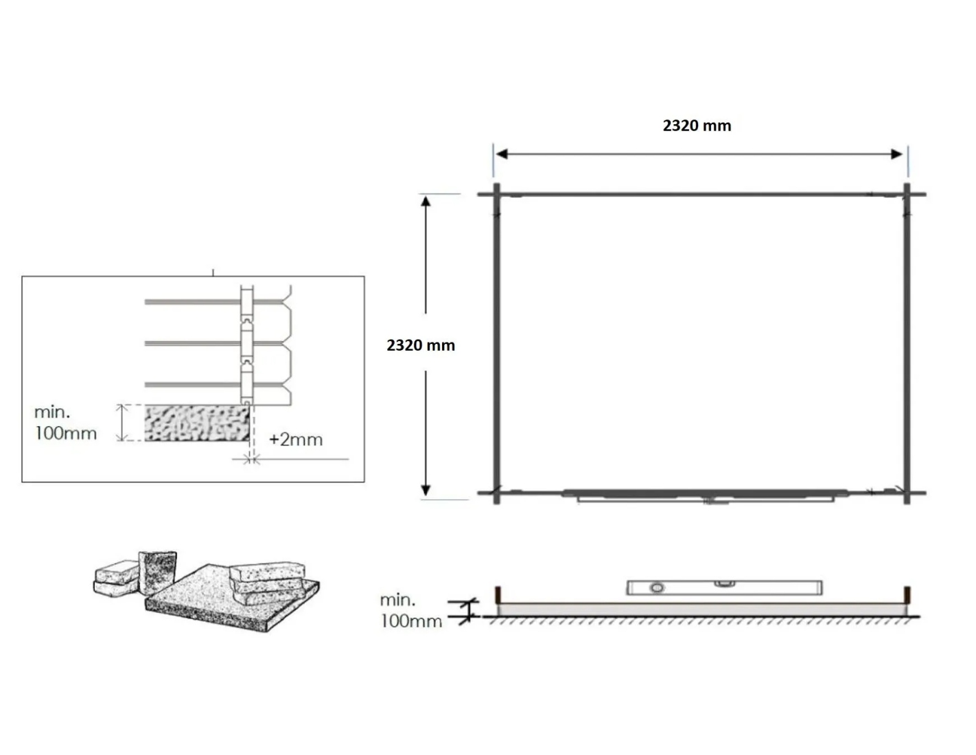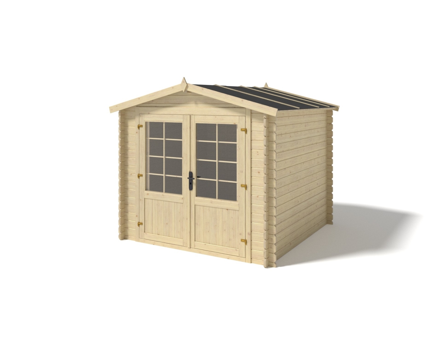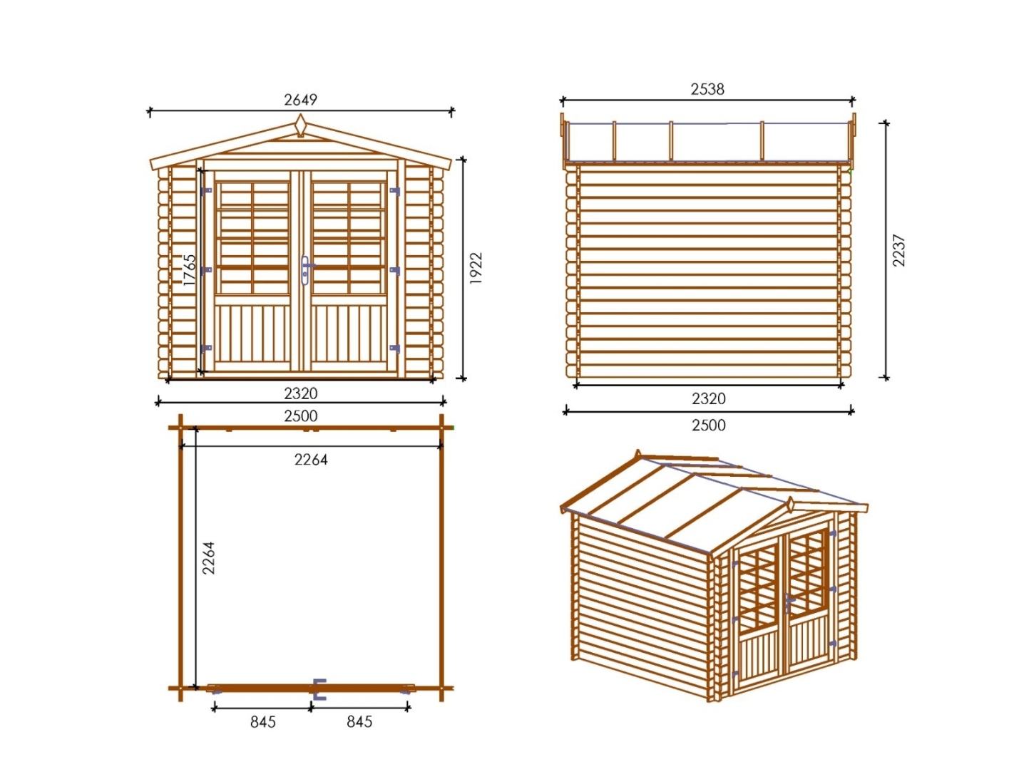 Sur les photos, il y a un chalet en bois DOM521 d'une superficie de 6.25m2. Dimensions au sol : L 2.5m et P 2.5m.