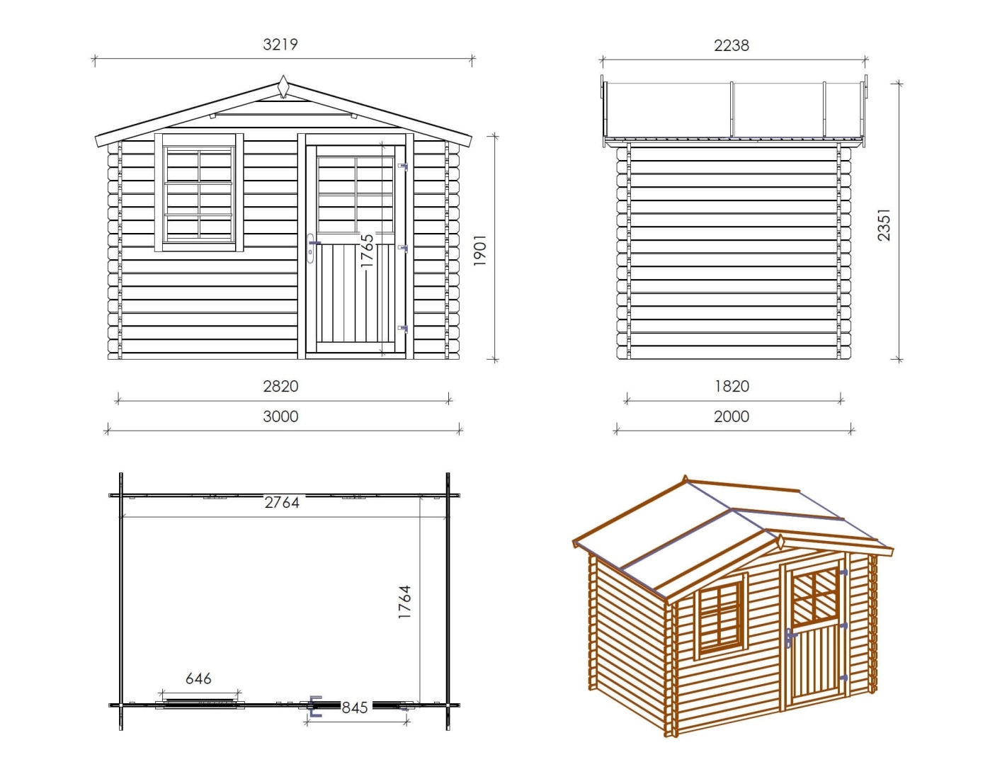 Sur les photos, il y a un chalet en bois DOM472 d'une superficie de 6m2. Dimensions au sol : L 3m et P 2m.