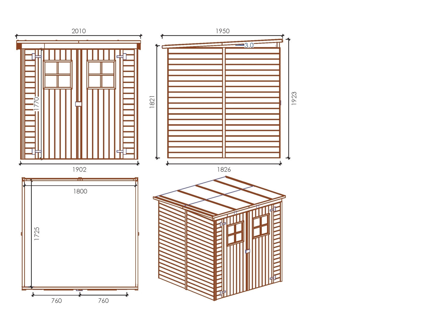 Abri de jardin en bois à outils DOM10 d'une surface de 3.42 m2, avec une largeur de 1.9 m en façade, une profondeur de 1.8 m et une épaisseur de parois de 12.5 mm. L'assemblage de l'abri avec les instructions incluses ne pose pas de problème.