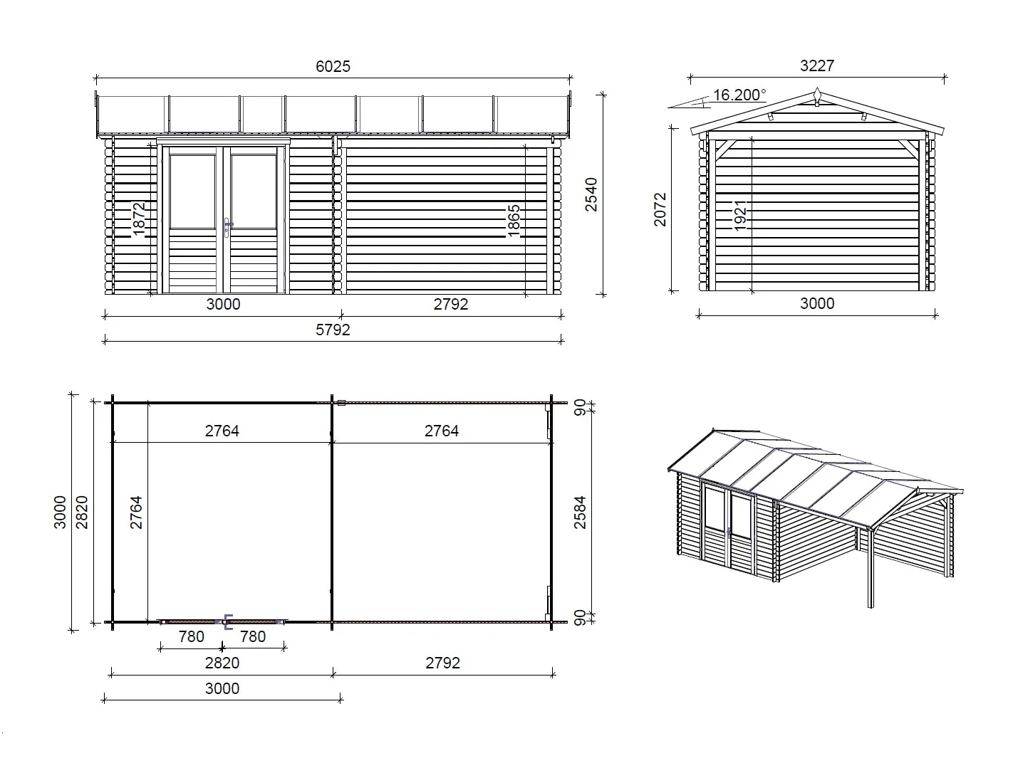 Abri de jardin en bois, à outils DOM639 d'une surface de 17.4m2, avec une largeur de 5.79m en façade, une profondeur de 3 m et une épaisseur de parois de 28mm. L'assemblage de l'abri avec les instructions incluses ne pose pas de problème.
