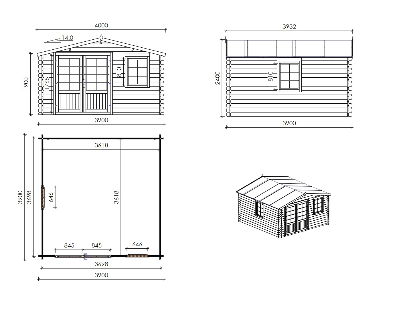 Chalet de jardin en bois DOM658 de ALTANKA p.s.a. est fait de bois de haute qualité. Les dimensions sont suivantes : 3.9m de large et 3.9m de profondeur ce que garantie beaucoup d'espace à l'intérieur.