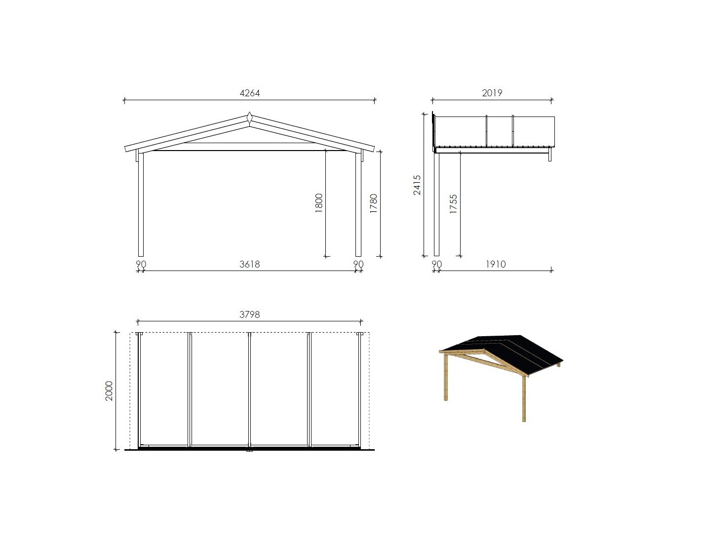 Abri + terrasse et avant-toit - abri d'une superficie de 24 m2, une largeur de façade de 4 m, une profondeur de 4 m et une épaisseur de parois de 40 mm.