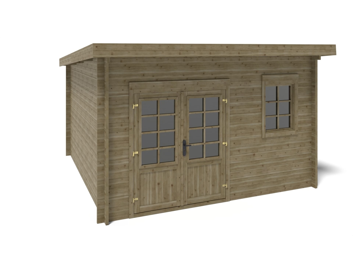 Sur les photos, il y a un chalet en bois DOM717 d'une superficie de 12m2. Dimensions au sol : L 4m et P 3m.
