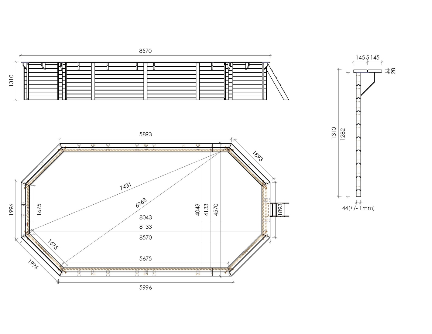 Découvrez notre piscine en bois de dimensions 8.57 m x 4.57 m et d'une hauteur de 1.31 m, fabriquée en bois de pin, imprégnée dans la couleur vert. L'épaisseur des planches est de 44 mm (+/- 1mm), garantissant une construction très solide pour la piscine. L'épaisseur des planches de terrasse est de 28 mm.