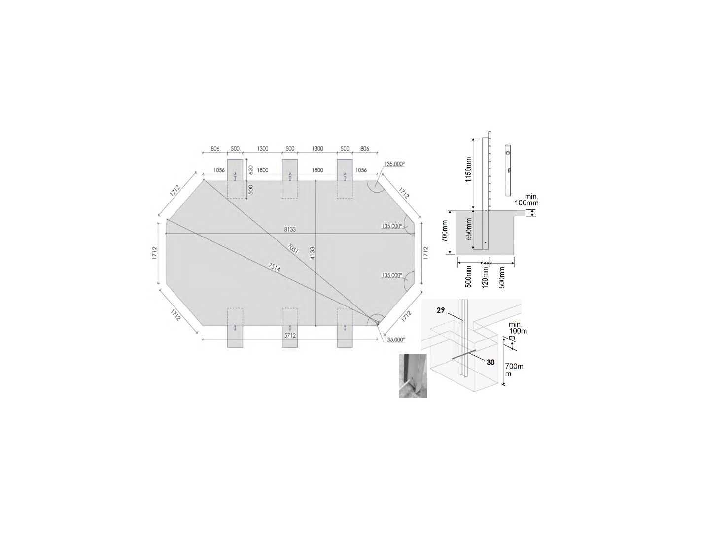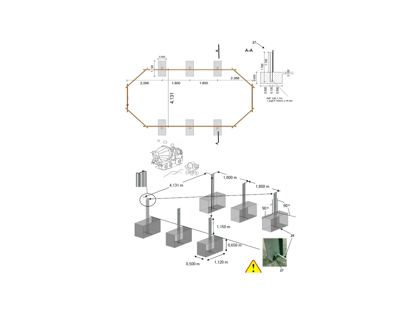Avant de commencer les travaux de construction, il est important de prendre en compte que les supports métalliques IPN sont fournis avec la piscine. La préparation du sol doit uniquement inclure un nivellement adéquat du terrain, tandis que le coulage du béton ne doit être effectué qu’après la réception de l’ensemble complet, afin d’ancrer correctement les supports dans les fondations. Il est recommandé de réaliser une dalle en béton d'une épaisseur minimale de 10 cm sous l’ensemble de la piscine et d’au moins 65 cm pour les supports IPN. Toutefois, cette dalle ne doit pas être coulée avant l’installation des IPN.