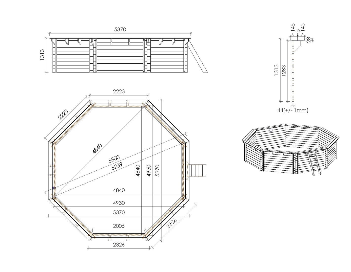 Découvrez notre piscine en bois de dimensions 5.37 m x 5.37 m et d'une hauteur de 1.31 m, fabriquée en bois de pin, imprégnée dans la couleur marron. L'épaisseur des planches est de 44 mm (+/- 1mm), garantissant une construction très solide de la piscine. L'épaisseur des planches de terrasse est de 28 mm.