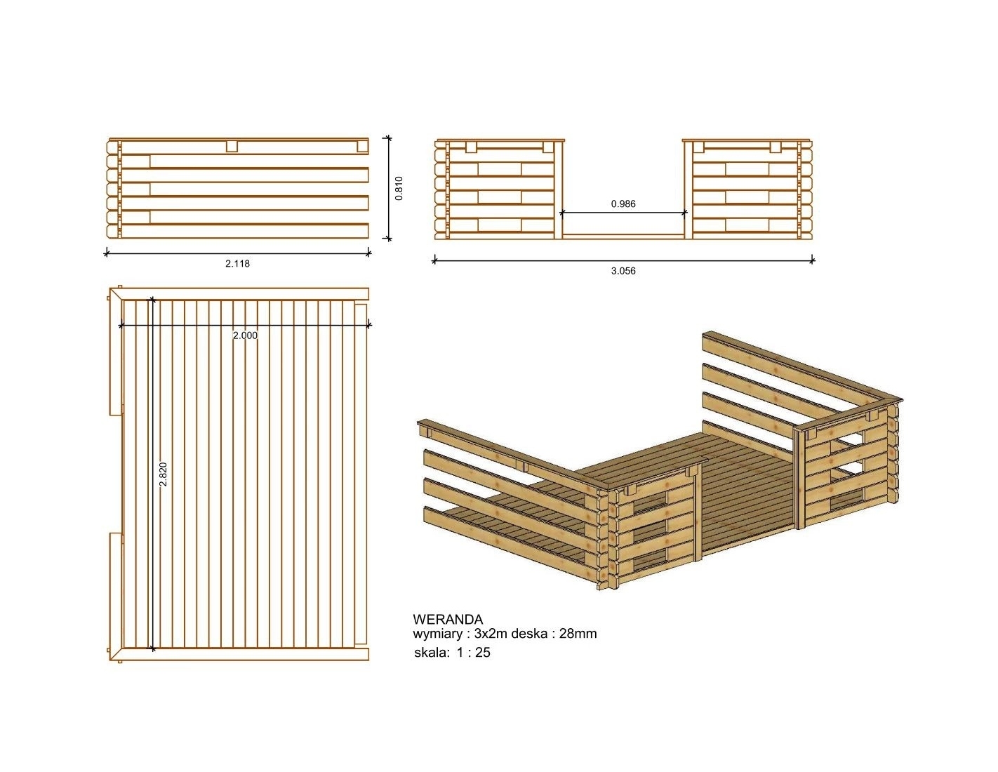 Terrasse en bois avec balustrade DOM147 d'une superficie de 6 m2, d'une largeur de 3 m et d'une profondeur de 2 m. La terrase s'adapte aux abris en bois d'une largeur de 3 m en façade et d'une épaisseur de 28 mm, proposés par ALTANKA p.s.a. Le montage avec les instructions incluses ne pose pas de problèmes.
