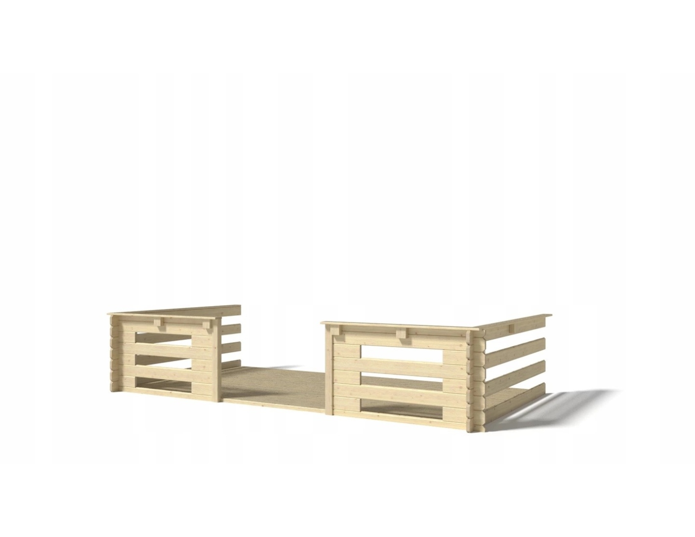 Terrasse en bois avec balustrade DOM18 d'une superficie de 8 m2, d'une largeur de 4 m et d'une profondeur de 2 m. La terrase s'adapte aux abris en bois d'une largeur de 4 m en façade et d'une épaisseur de 28 mm, proposés par ALTANKA p.s.a. Le montage avec les instructions incluses ne pose pas de problèmes.