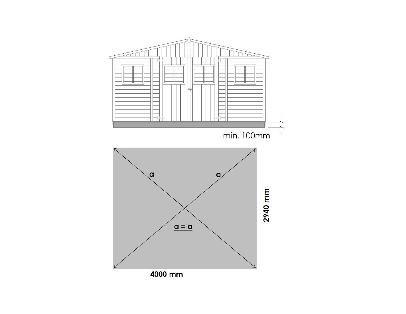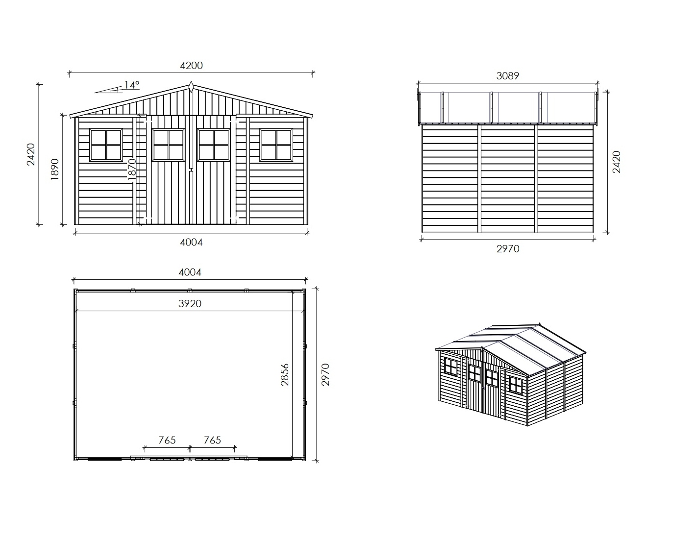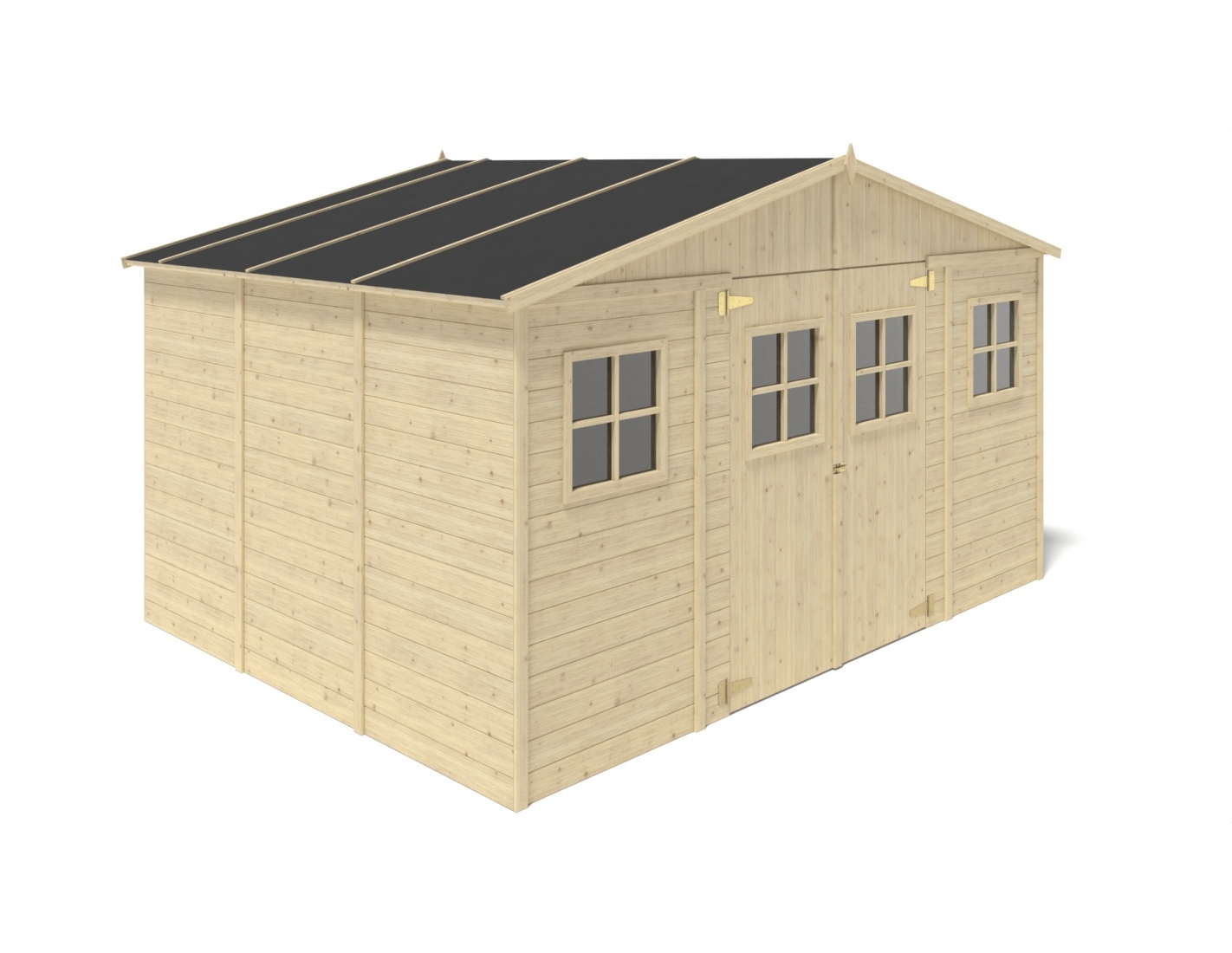 Abri de jardin en bois, à outils DOM667 d'une surface de 11.88 m2, avec une largeur de 4 m en façade, une profondeur de 2.97 m et une épaisseur de parois de 16 mm. L'assemblage de l'abri avec les instructions incluses ne pose pas de problème.