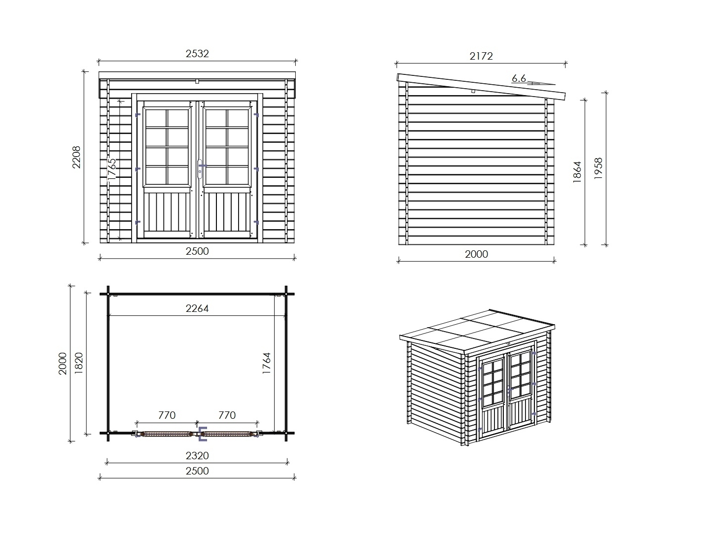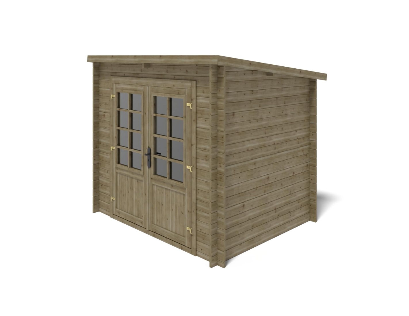 Abri de jardin en bois DOM725 de ALTANKA p.s.a. est fait de bois de haute qualité. Les dimensions sont suivantes : 2.5m de large et 2m de profondeur.