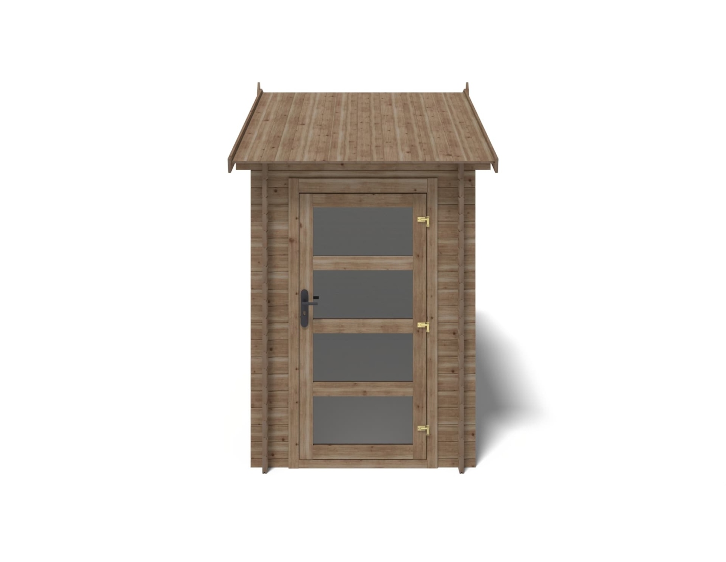 Sur les photos, il y a un chalet en bois DOM673 d'une superficie de 4.5m2. Dimensions au sol : L 1.5m et P 3m.