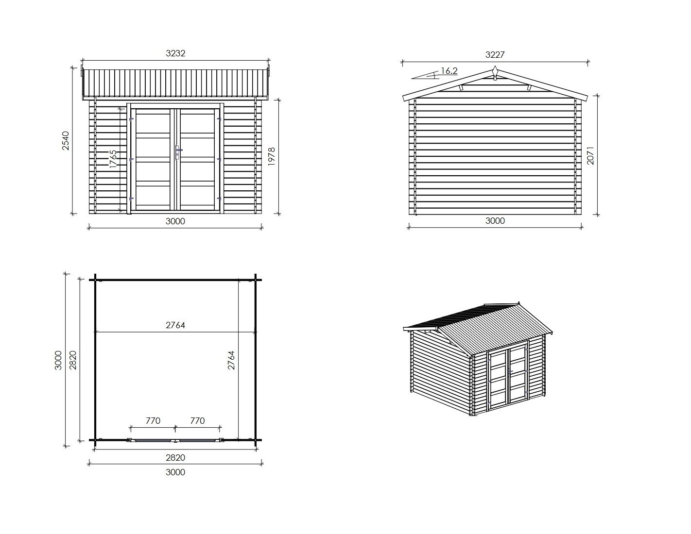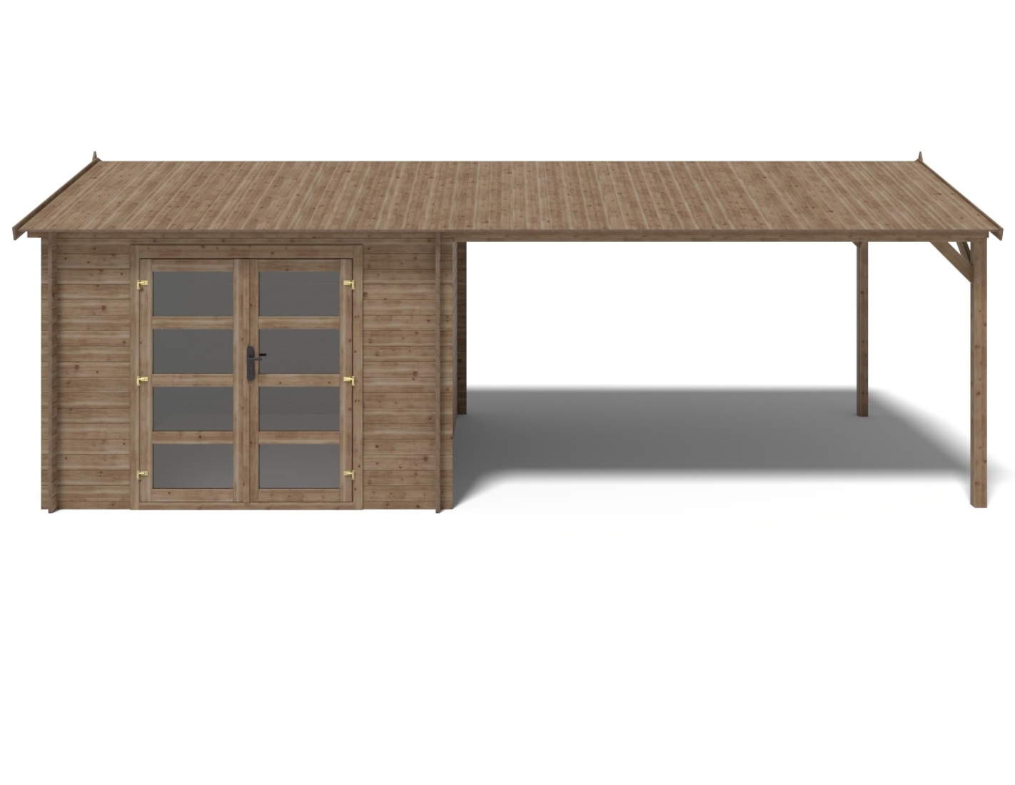 Abri à outils en bois DOM676+DOS194 d’une superficie de 20 m², avec une façade de 3 m, une profondeur de 3 m et une épaisseur de parois de 28 mm.