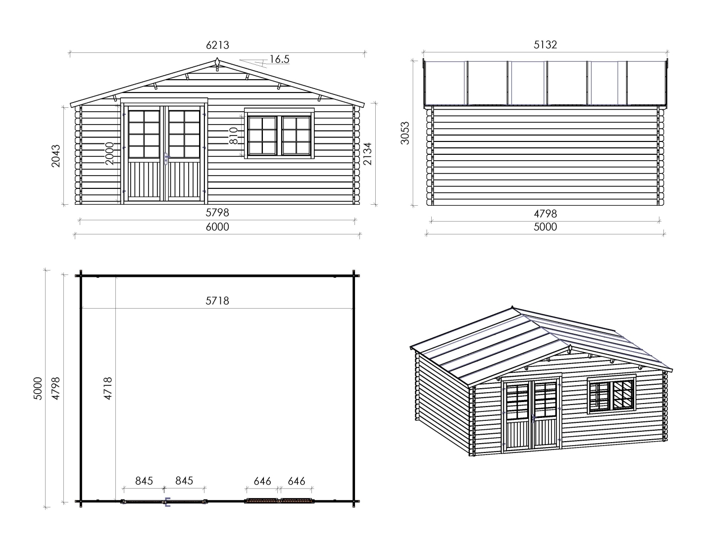 Abri + terrasse et avant-toit - abri d'une superficie de 42 m2, une largeur de façade de 6 m, une profondeur de 5 m et une épaisseur de parois de 40 mm.