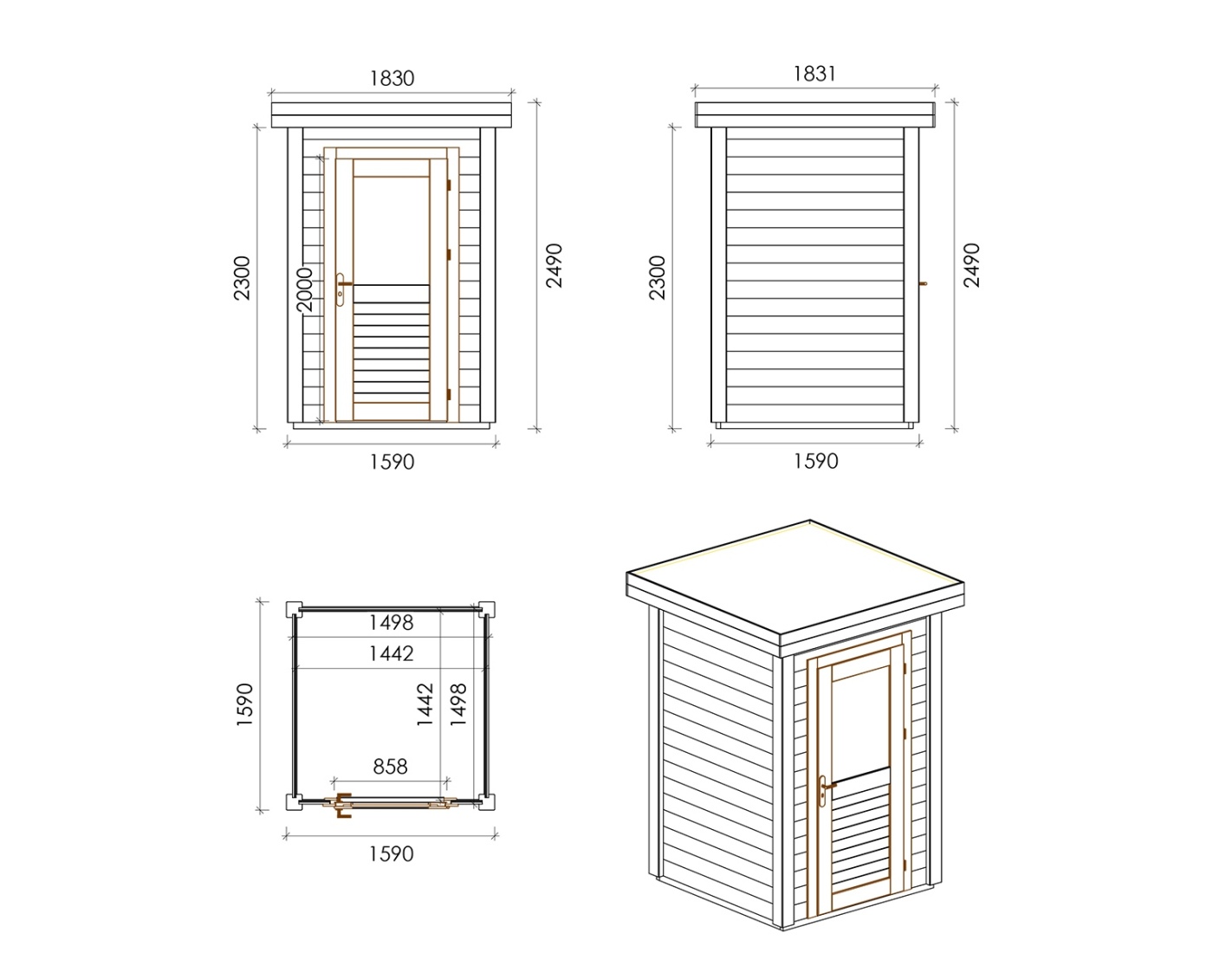 Chalet de jardin en bois 000108 est fait de bois de haute qualité. Les dimensions sont suivantes : 1.59m de large et 1.59m de profondeur ce que garantie beaucoup d'espace à l'intérieur.