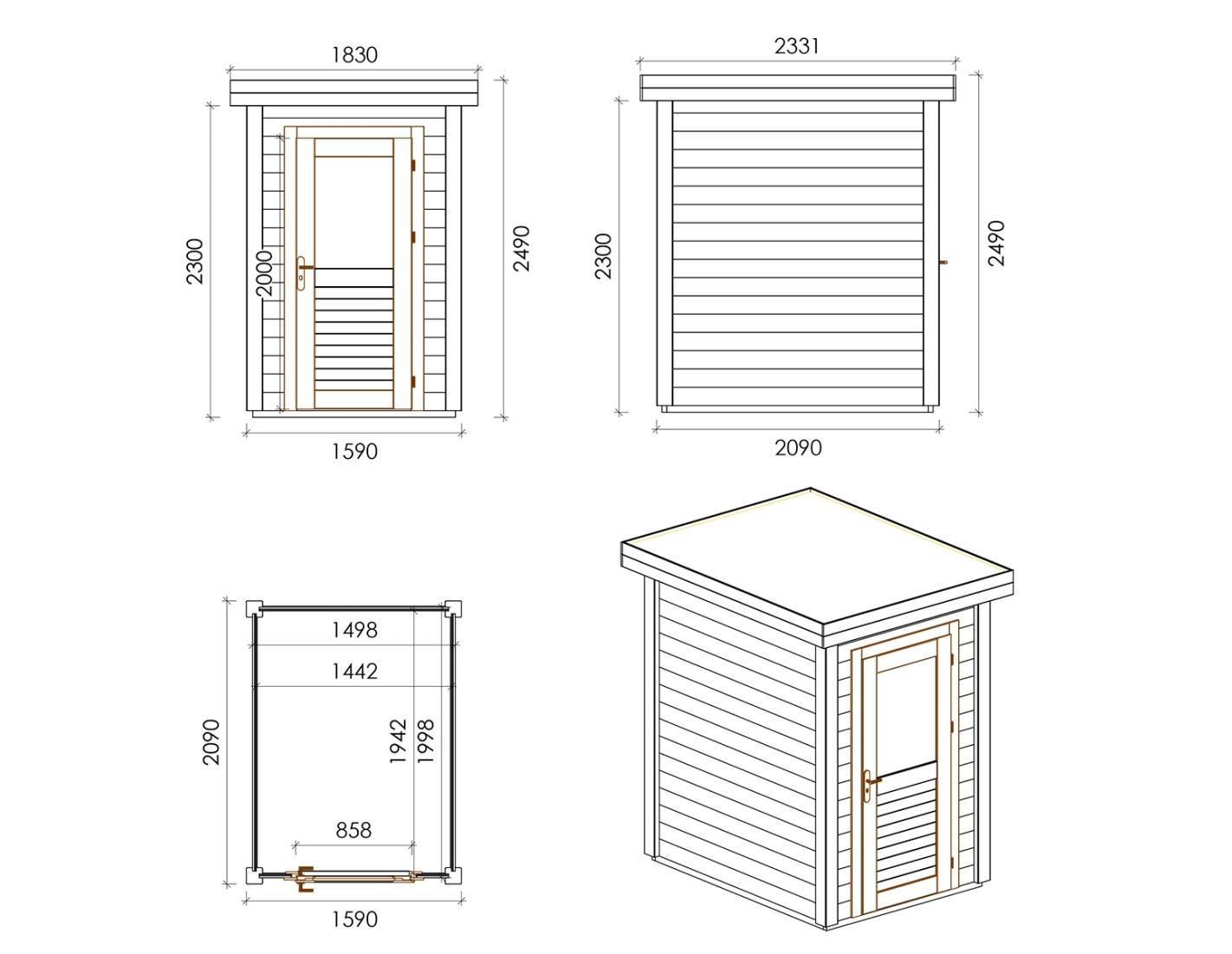 Chalet de jardin en bois 000109 est fait de bois de haute qualité. Les dimensions sont suivantes : 1.59m de large et 2.09m de profondeur ce que garantie beaucoup d'espace à l'intérieur.