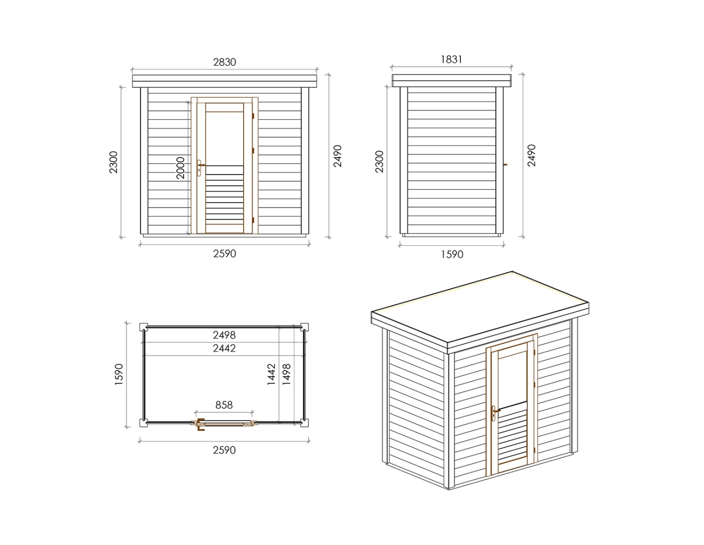 Chalet de jardin en bois 000116 est fait de bois de haute qualité. Les dimensions sont suivantes : 2.59m de large et 1.59m de profondeur ce que garantie beaucoup d'espace à l'intérieur.