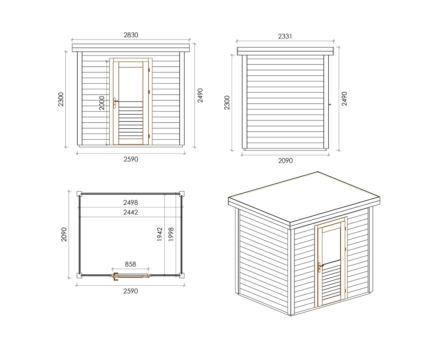 Chalet de jardin en bois 000117 est fait de bois de haute qualité. Les dimensions sont suivantes : 2.59m de large et 2.09m de profondeur ce que garantie beaucoup d'espace à l'intérieur.