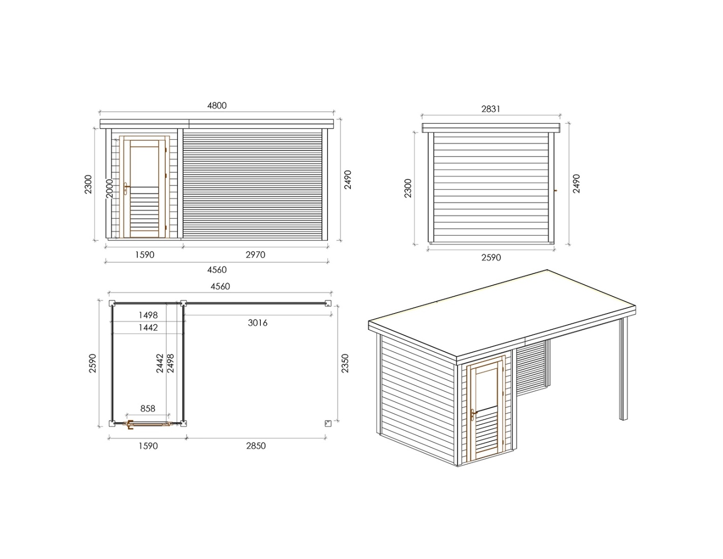 Chalet de jardin en bois 000133 est fait de bois de haute qualité. Les dimensions sont suivantes : 4.56m de large et 2.59m de profondeur ce que garantie beaucoup d'espace à l'intérieur.