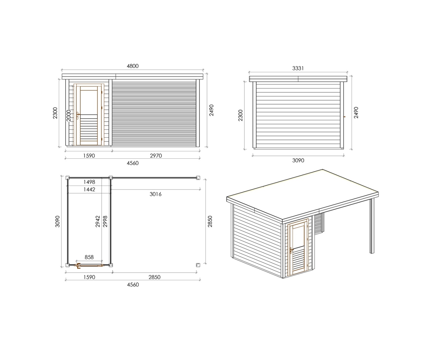 Chalet de jardin en bois 000135 est fait de bois de haute qualité. Les dimensions sont suivantes : 4.56m de large et 3.09m de profondeur ce que garantie beaucoup d'espace à l'intérieur.