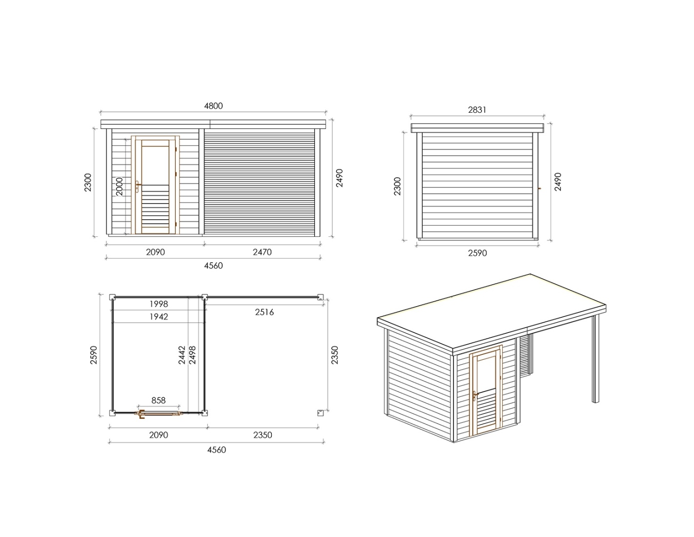 Chalet de jardin en bois 000137 est fait de bois de haute qualité. Les dimensions sont suivantes : 4.56m de large et 2.59m de profondeur ce que garantie beaucoup d'espace à l'intérieur.