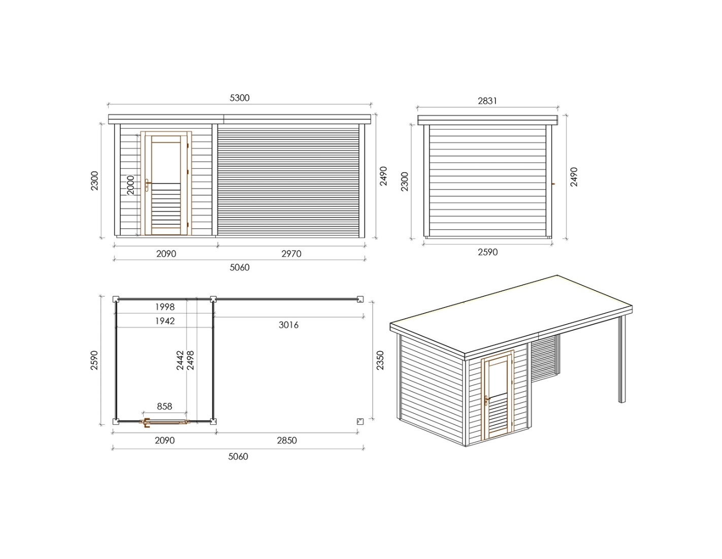 Chalet de jardin en bois 000138 est fait de bois de haute qualité. Les dimensions sont suivantes : 5.06m de large et 2.59m de profondeur ce que garantie beaucoup d'espace à l'intérieur.
