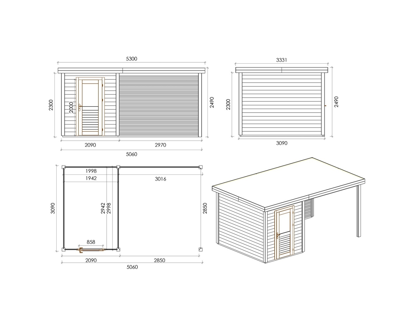 Chalet de jardin en bois 000140 est fait de bois de haute qualité. Les dimensions sont suivantes : 5.06m de large et 3.09m de profondeur ce que garantie beaucoup d'espace à l'intérieur.