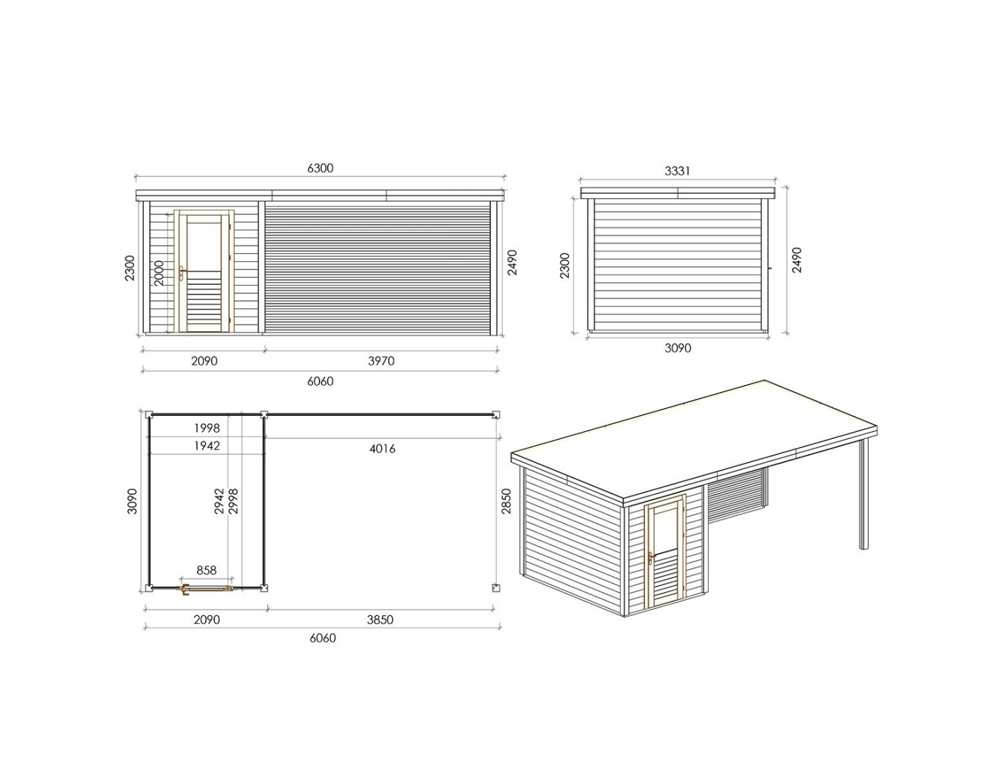 Chalet de jardin en bois 000141 est fait de bois de haute qualité. Les dimensions sont suivantes : 6.06m de large et 3.09m de profondeur ce que garantie beaucoup d'espace à l'intérieur.