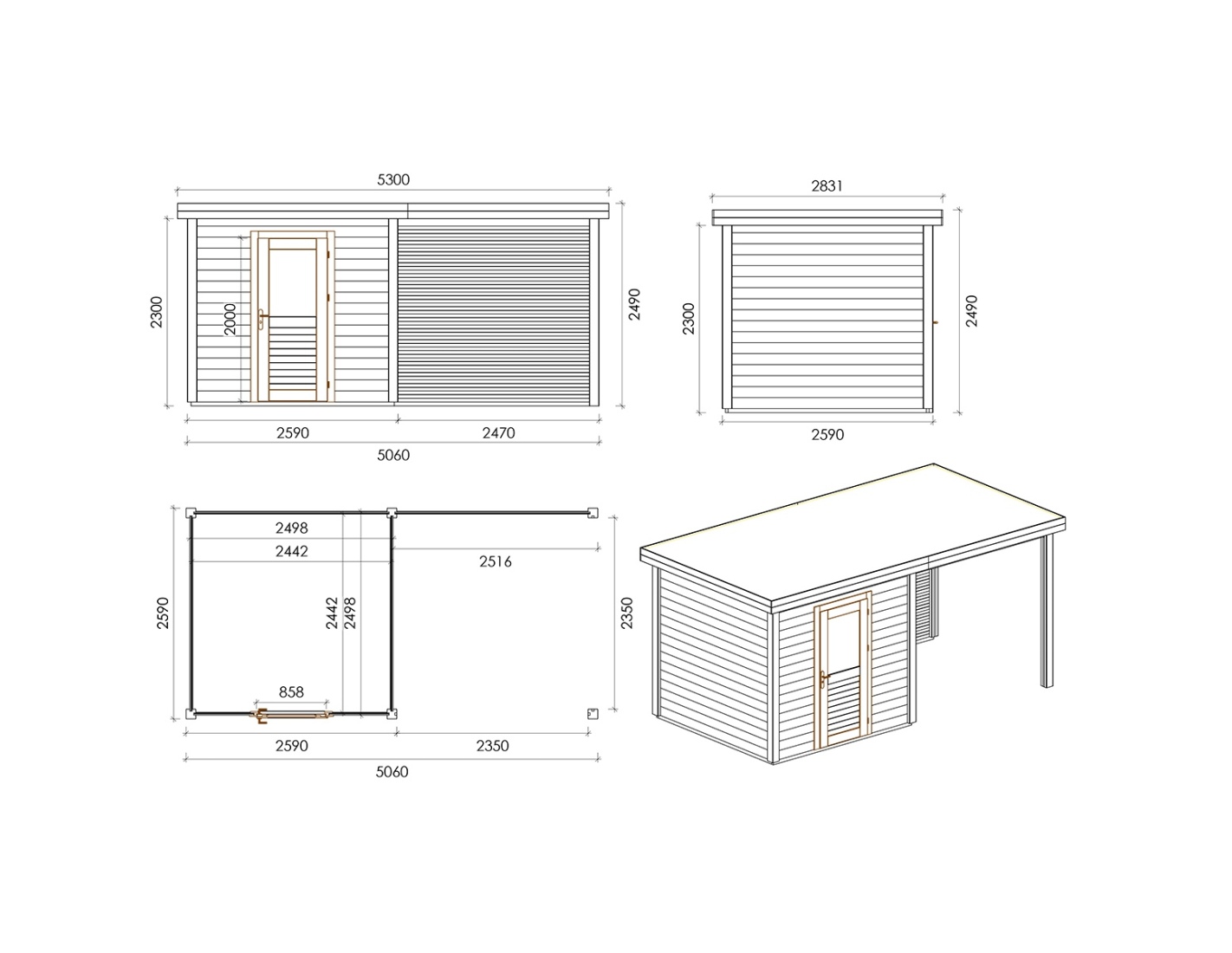 Chalet de jardin en bois 000142 est fait de bois de haute qualité. Les dimensions sont suivantes : 5.06m de large et 2.59m de profondeur ce que garantie beaucoup d'espace à l'intérieur.