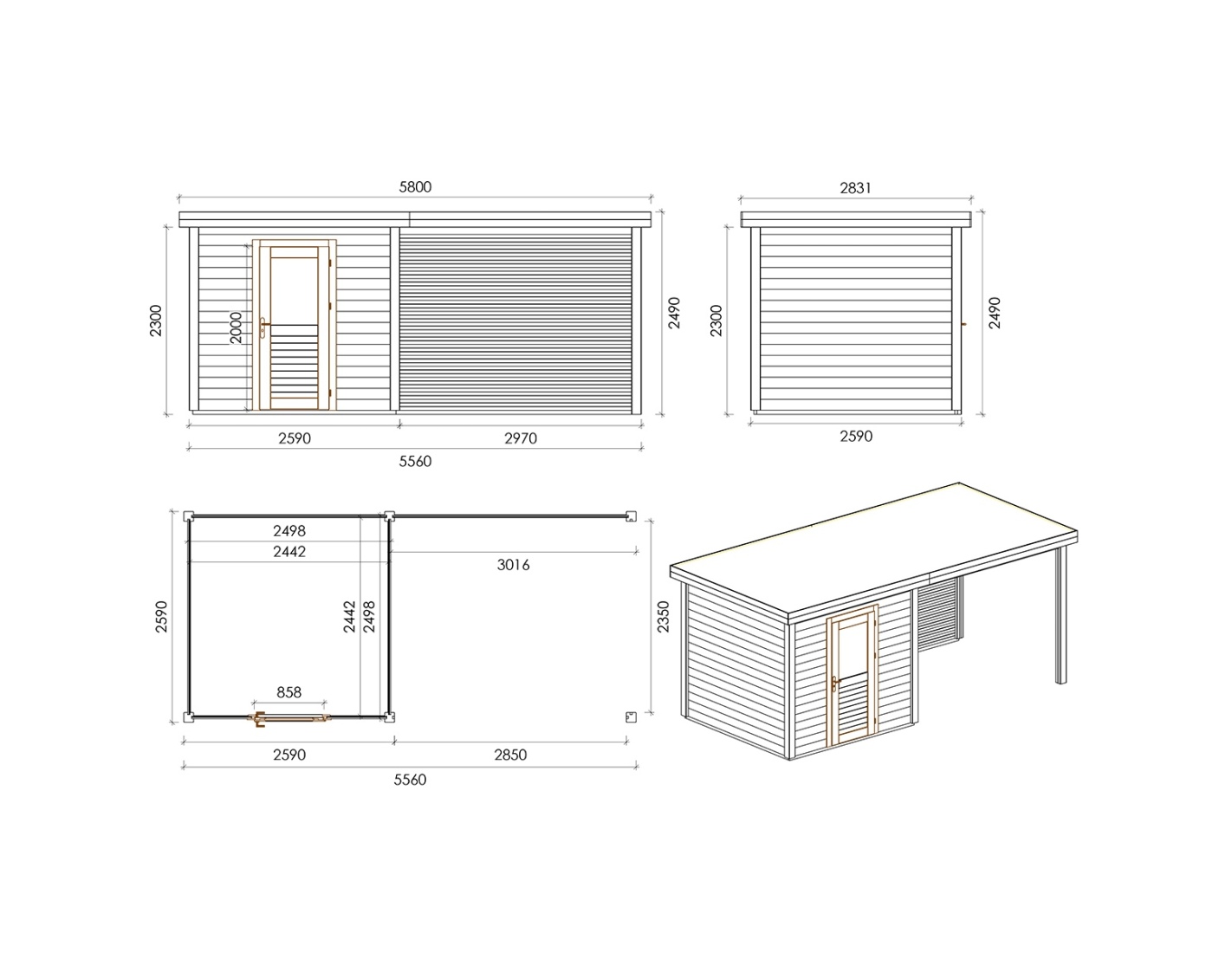 Chalet de jardin en bois 000143 est fait de bois de haute qualité. Les dimensions sont suivantes : 5.56m de large et 2.59m de profondeur ce que garantie beaucoup d'espace à l'intérieur.