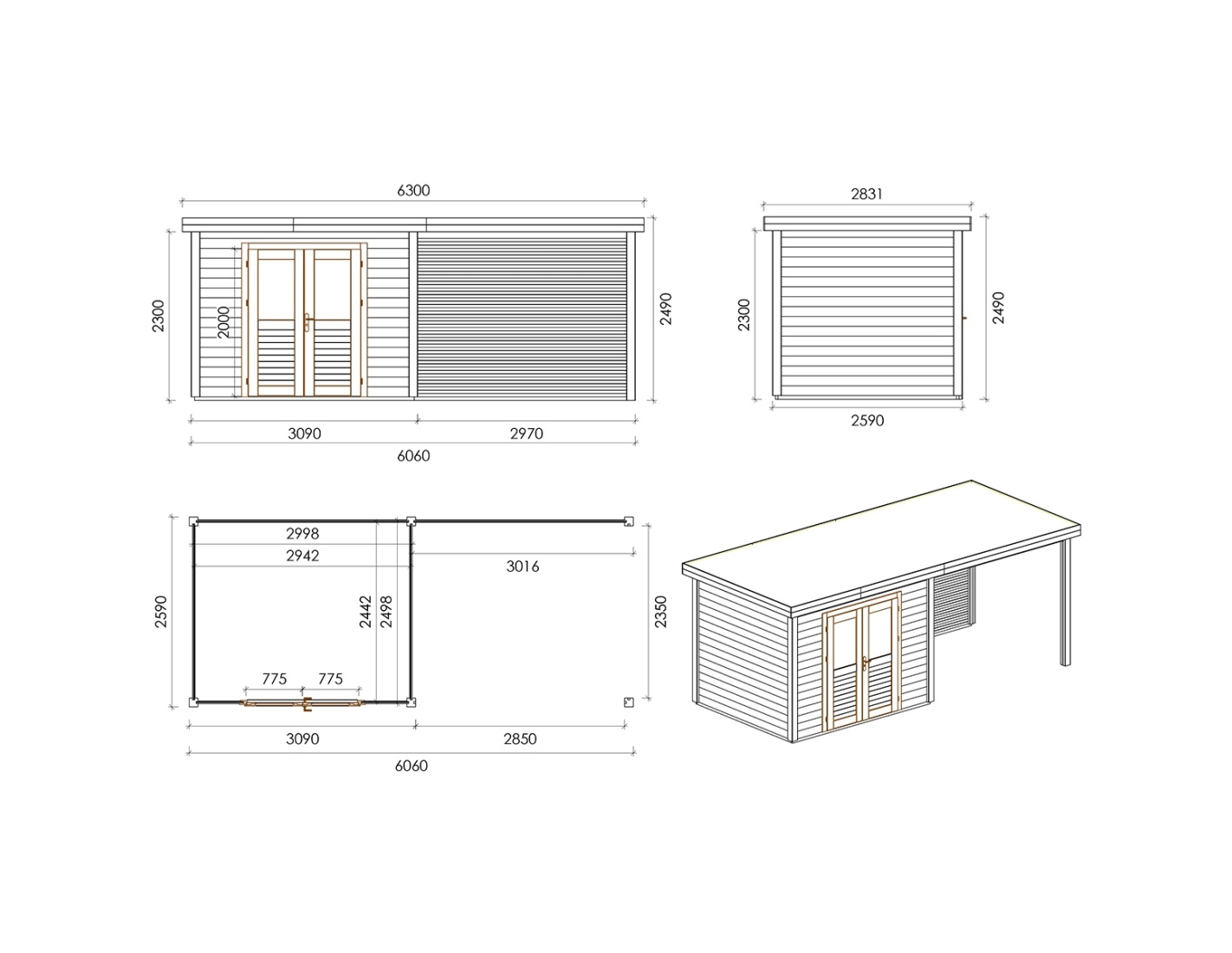 Chalet de jardin en bois 000148 est fait de bois de haute qualité. Les dimensions sont suivantes : 6.06m de large et 2.59m de profondeur ce que garantie beaucoup d'espace à l'intérieur.