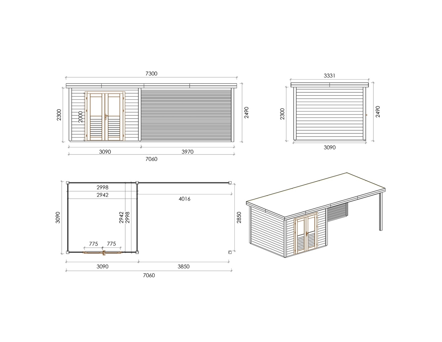 Chalet de jardin en bois 000151 est fait de bois de haute qualité. Les dimensions sont suivantes : 7.06m de large et 3.09m de profondeur ce que garantie beaucoup d'espace à l'intérieur.