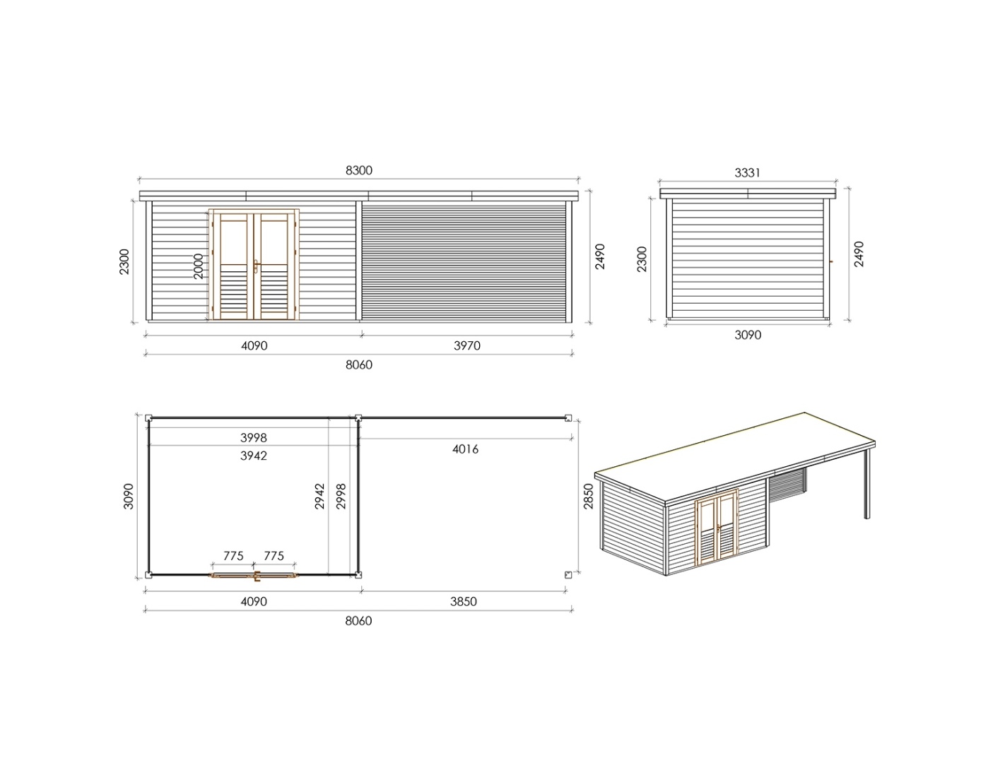 Chalet de jardin en bois 000156 est fait de bois de haute qualité. Les dimensions sont suivantes : 7.06m de large et 3.09m de profondeur ce que garantie beaucoup d'espace à l'intérieur.