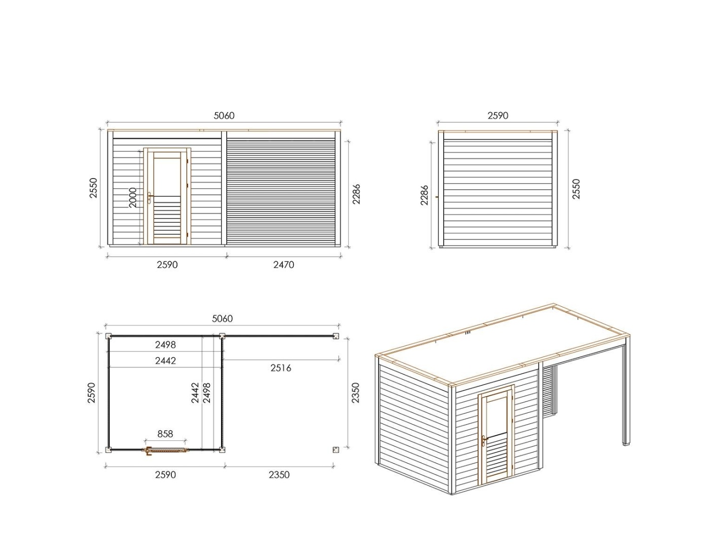 Chalet de jardin en bois 000191 est fait de bois de haute qualité. Les dimensions sont suivantes : 5.06m de large et 2.59m de profondeur ce que garantie beaucoup d'espace à l'intérieur.