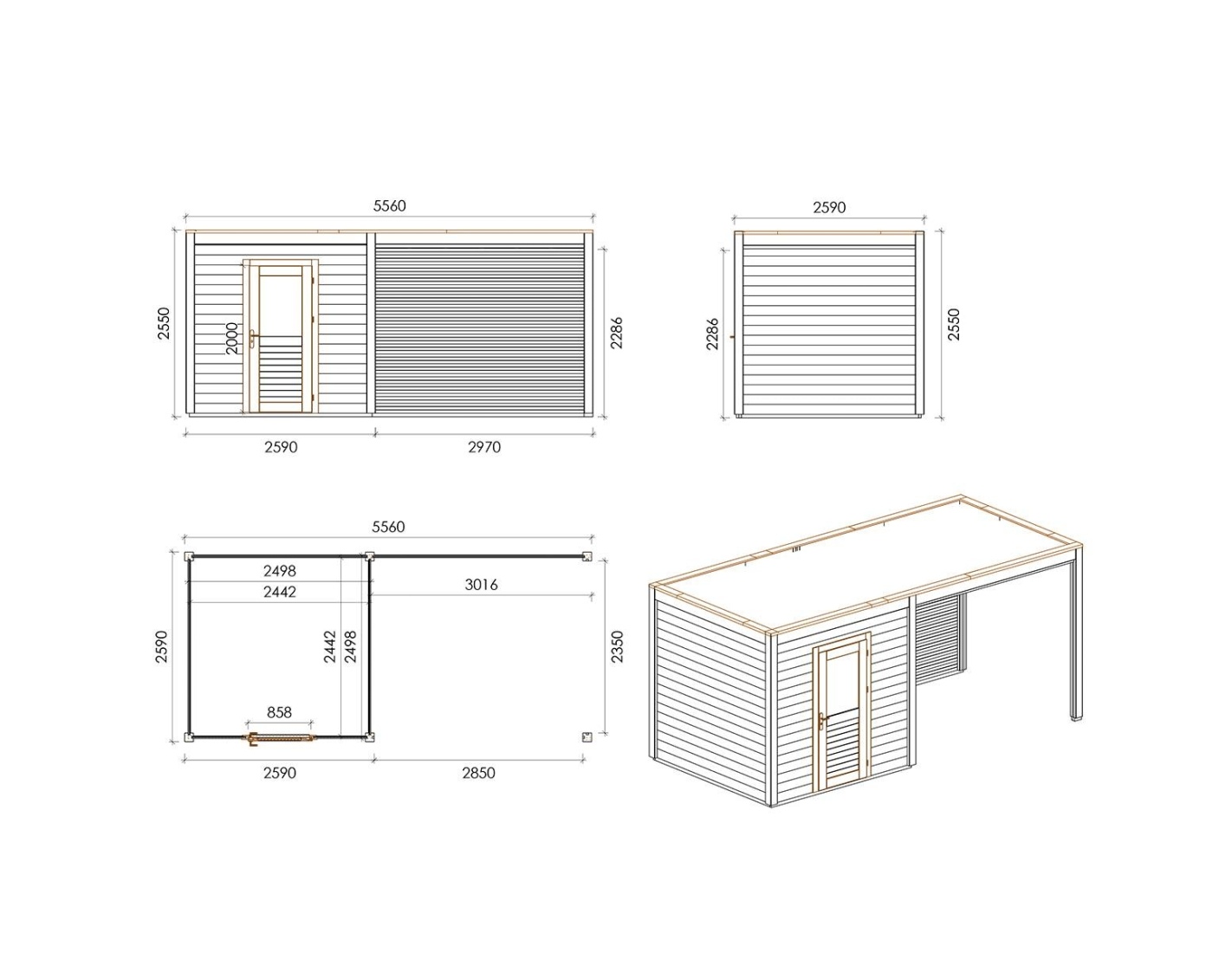 Chalet de jardin en bois 000192 est fait de bois de haute qualité. Les dimensions sont suivantes : 5.56m de large et 2.59m de profondeur ce que garantie beaucoup d'espace à l'intérieur.