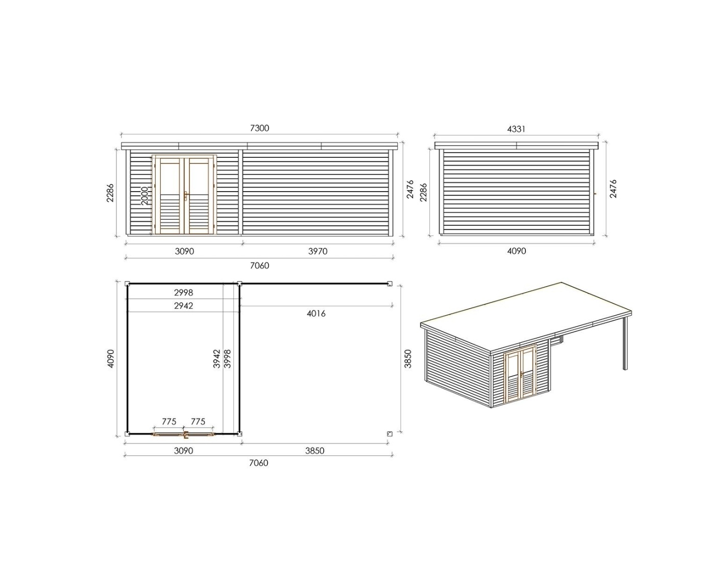 Chalet de jardin en bois 000243 est fait de bois de haute qualité. Les dimensions sont suivantes : 7.06m de large et 4.09m de profondeur ce que garantie beaucoup d'espace à l'intérieur.