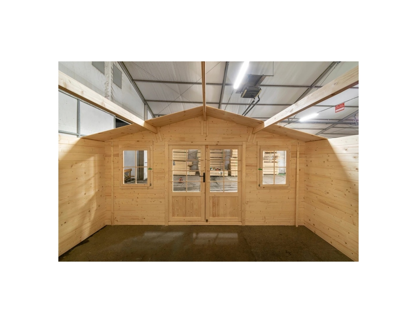 Sur les photos, il y a un chalet en bois DOM370 d'une superficie de 19.2m2. Dimensions au sol : L 4.8m et P 4m.