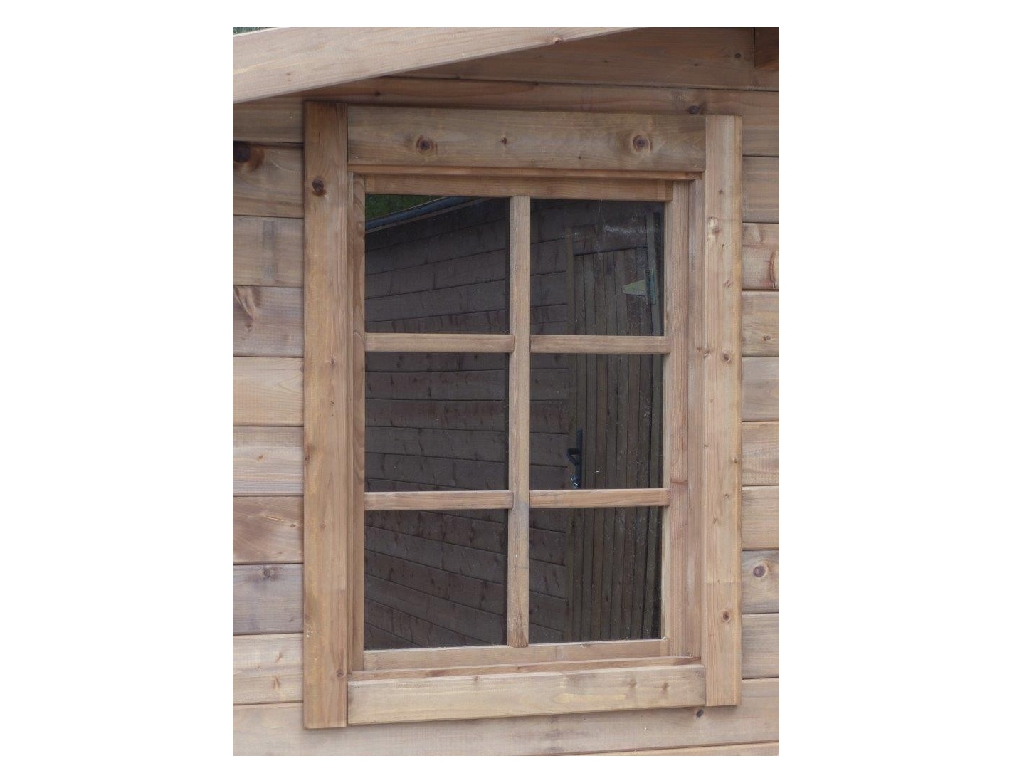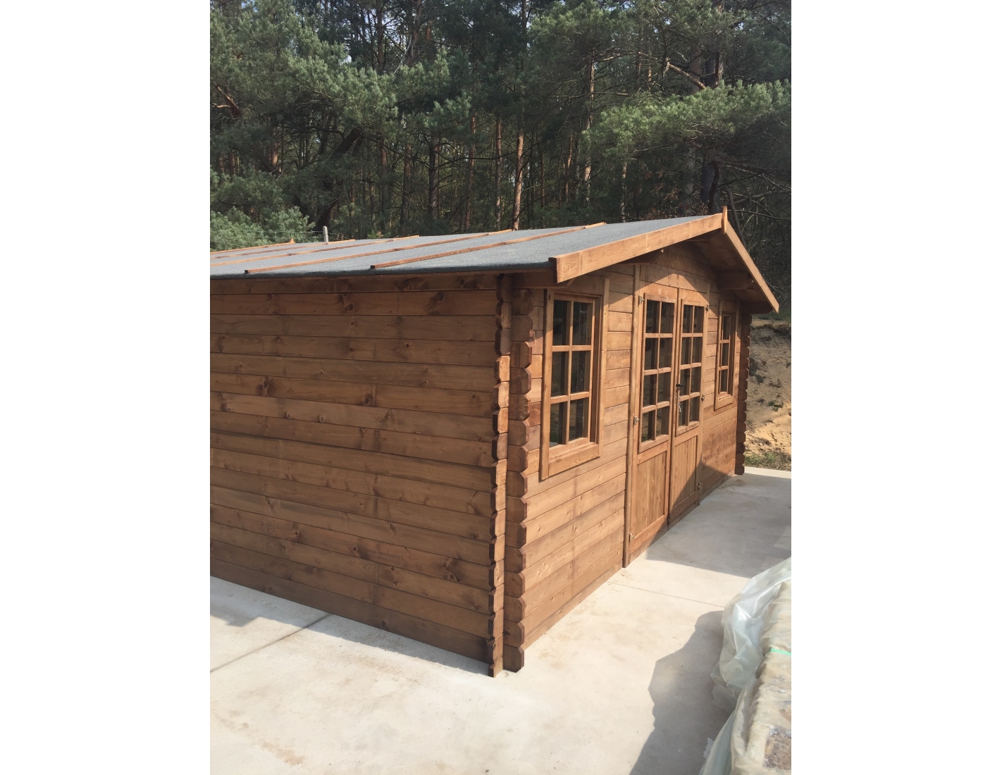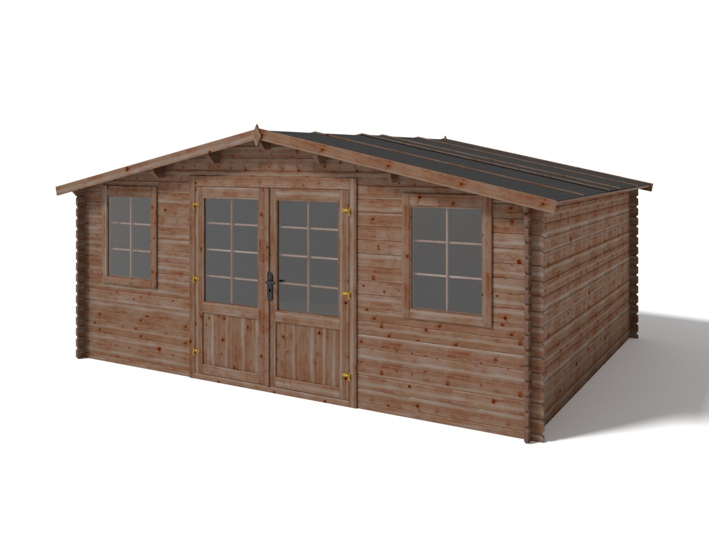 Sur les photos, il y a un chalet en bois DOM566 d'une superficie de 20m2. Dimensions au sol : L 5m et P 4m.