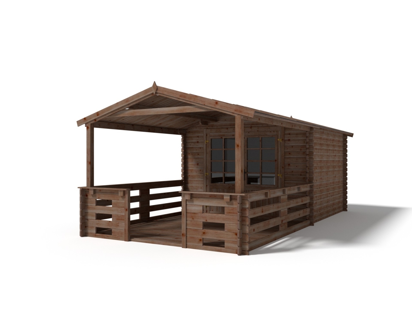 Abri + terrasse et avant-toit - abri d'une superficie de 18 m2, une largeur de façade de 3 m, une profondeur de 3 m et une épaisseur de parois de 28 mm.