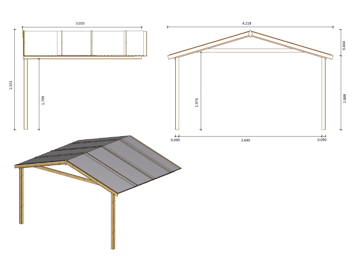 Abri + terrasse et avant-toit - abri d'une superficie de 28 m2, une largeur de façade de 4 m, une profondeur de 4 m et une épaisseur de parois de 28 mm.