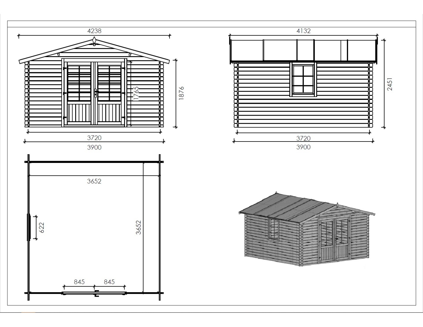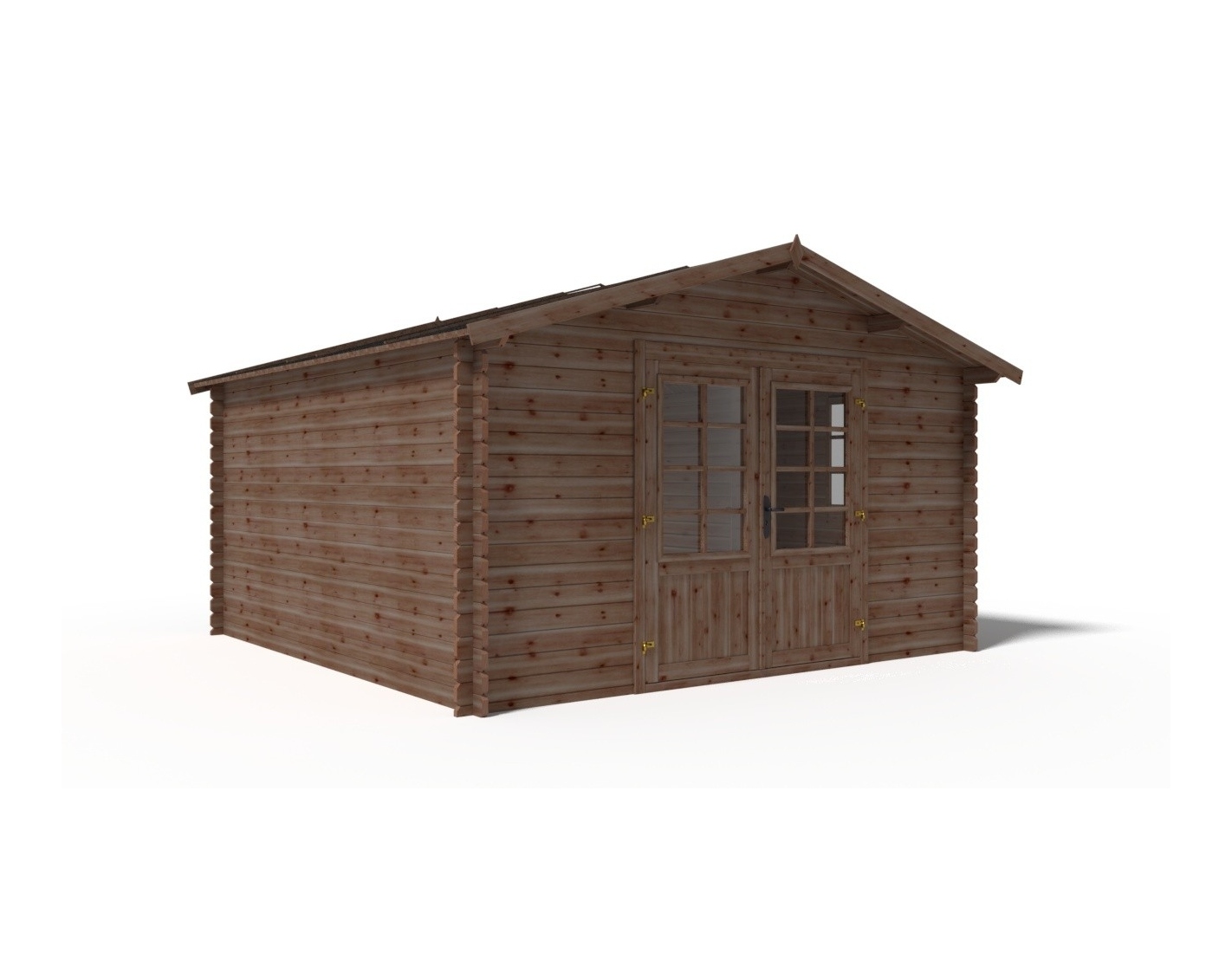 Sur les photos, il y a un chalet en bois DOM563 d'une superficie de 15.2m2. Dimensions au sol : L 3.9m et P 3.9m.