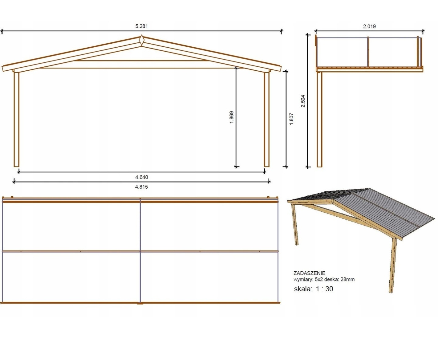 Abri + terrasse et avant-toit - abri d'une superficie de 30 m2, une largeur de façade de 5 m, une profondeur de 4 m et une épaisseur de parois de 28 mm.
