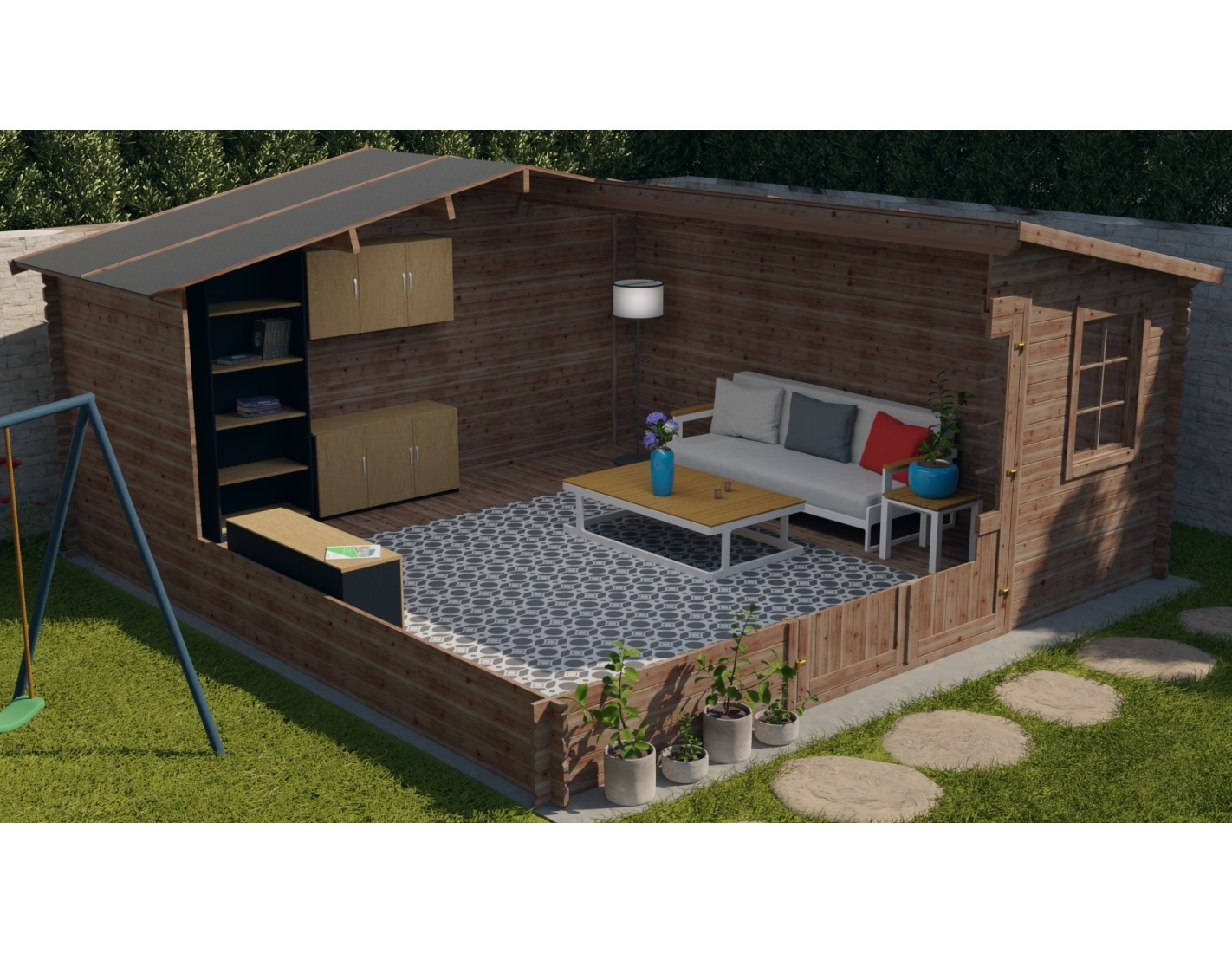 L'intérieur de l’abri est une forme régulière ce qui permet des aménagements libres, adaptatées aux besoins individuels. Cet abri de jardin est l'endroit idéal pour les réunions familiales, un atelier ou un lieu de détente. C'est aussi une proposition excellente pour les enfants qui rêvent d'avoir leur propre espace de jeux.
