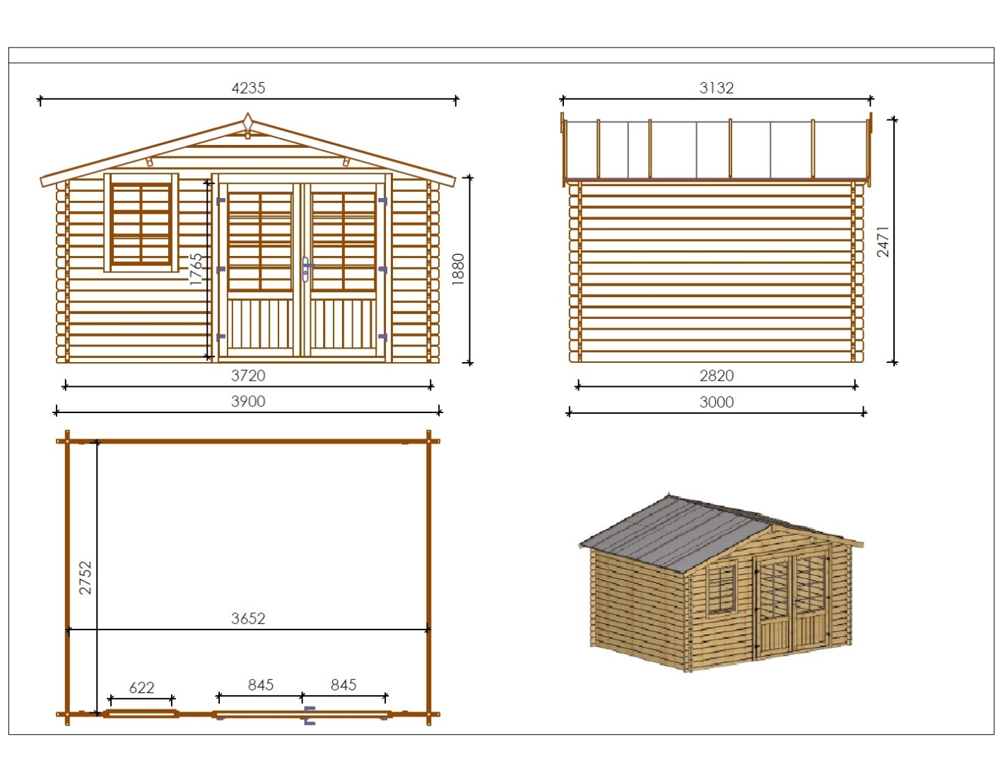 Sur les photos, il y a un chalet en bois DOM562 d'une superficie de 11.7m2. Dimensions au sol : L 3.9m et P 3m.