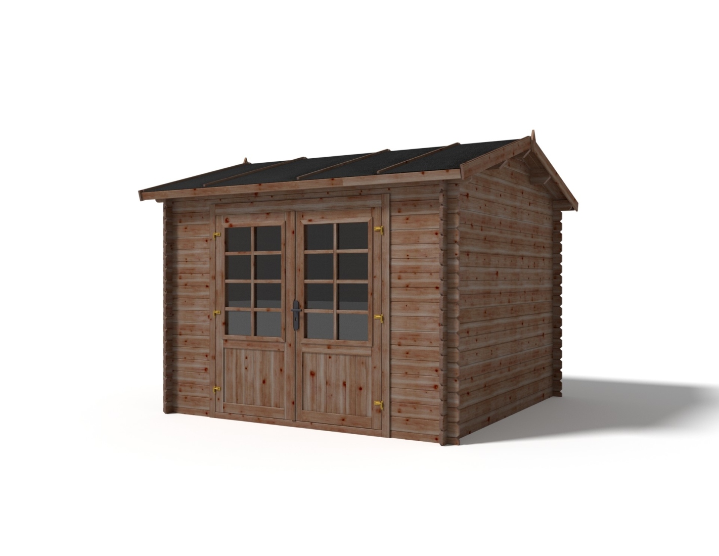 Sur les photos, il y a un chalet en bois DOM636 d'une superficie de 9m2. Dimensions au sol : L 3m et P 3m.