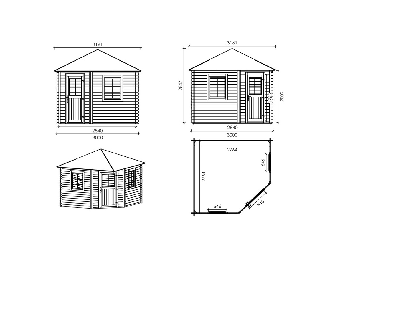 Sur les photos, il y a un chalet en bois DOM448 d'une superficie de 7.3m2. Dimensions au sol : L 3m et P 3m.