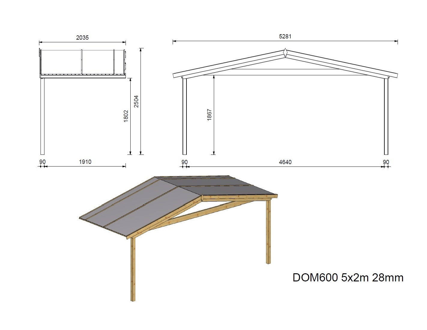 Abri + terrasse et avant-toit - abri d'une superficie de 25 m2, une largeur de façade de 5 m, une profondeur de 3 m et une épaisseur de parois de 28 mm.